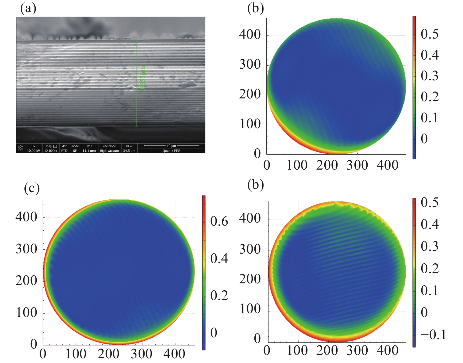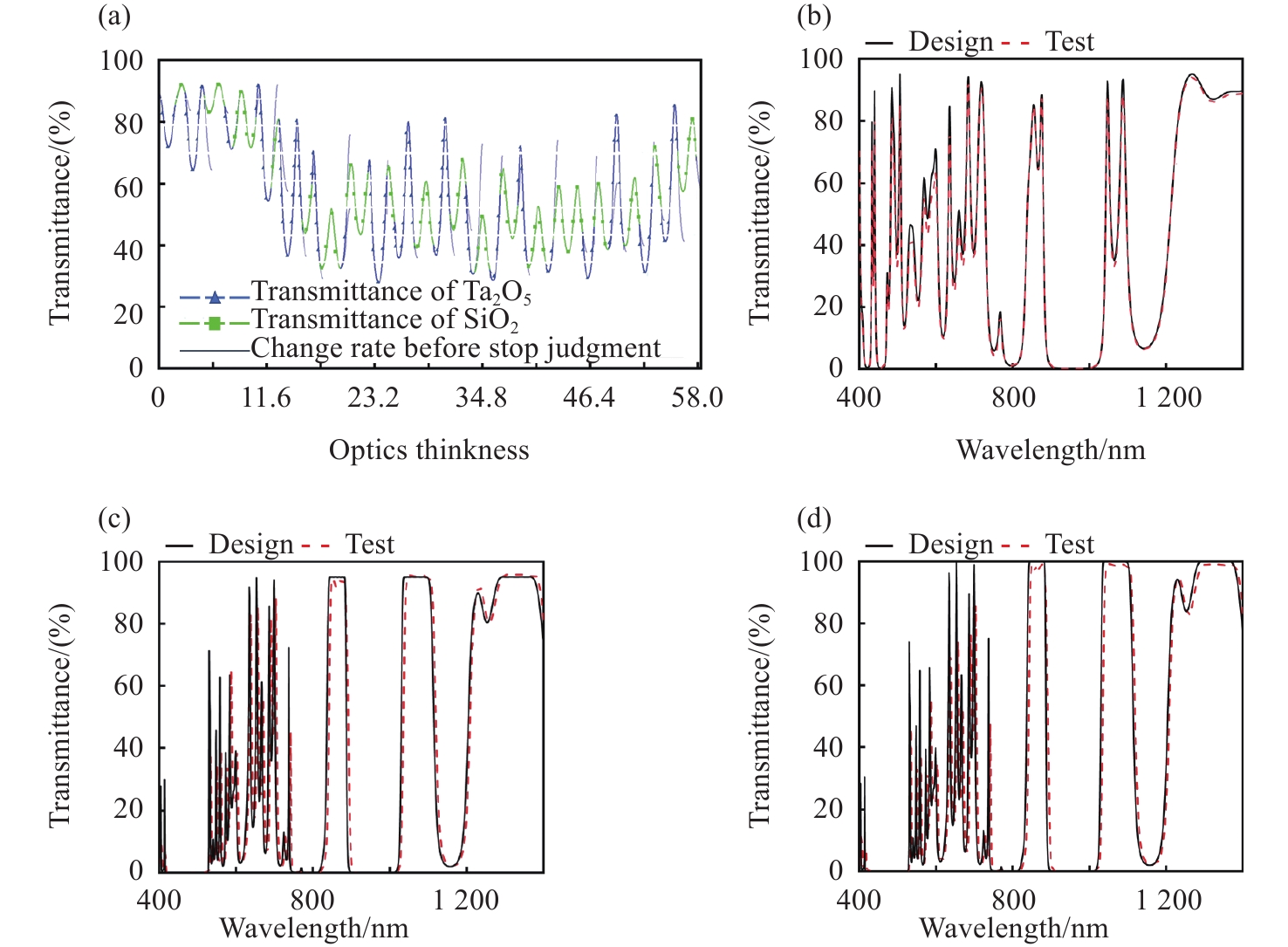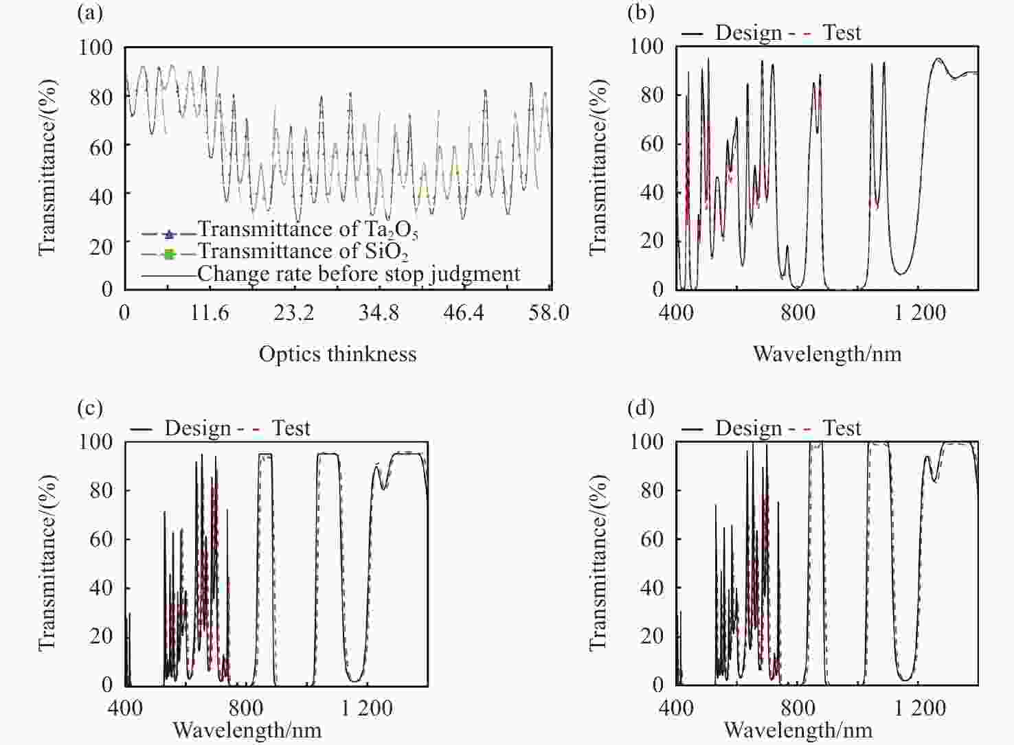 1000 nm波段的平均透过率分别为0.45%和0.16%。Abstract:Filters, as a key component in the photoelectric detection system, can simplify the optical system and improve detection efficiency. Based on the usage requirements, a visible/near-infrared filter film with up to 5 wavebands needs to be designed and prepared, while simultaneously satisfying high reflection in 2 wavebands and high transmittance in 3 wavebands. Therefore, we have conducted a systematic study on the film design, thin film preparation process, and control accuracy of film layer thickness. In this work, the short-wave pass film system is superimposed with the long-wave pass film system, and the number of cycles and matching coefficient of the film system are tuned to meet the requirements of cut-off band. Additionally, Smith method was used to match bandpass film system to optimize the transmission band and complete the visible/near infrared multiband laser filter film design. In the preparation process, combined with the sensitivity of the film layer, inverse analysis is used to invert the film layer monitored by each optical monitoring chip. The optical control scheme with weak optical signal in the monitoring process is simulated and corrected, and the monitoring wavelength with stronger optical signal is matched, resulting in an improvement of the control accuracy for the film thickness and the transmittance in the specified wavelength range. Ultimately, the actual physical thickness is 9.66 μm, and the error with the theoretical design thickness is less than 0.4%, and the transmittance of the specified 3 wavebands exceeds 99%. The average transmittance of the cut-off bands at the 455−500 nm and 910−