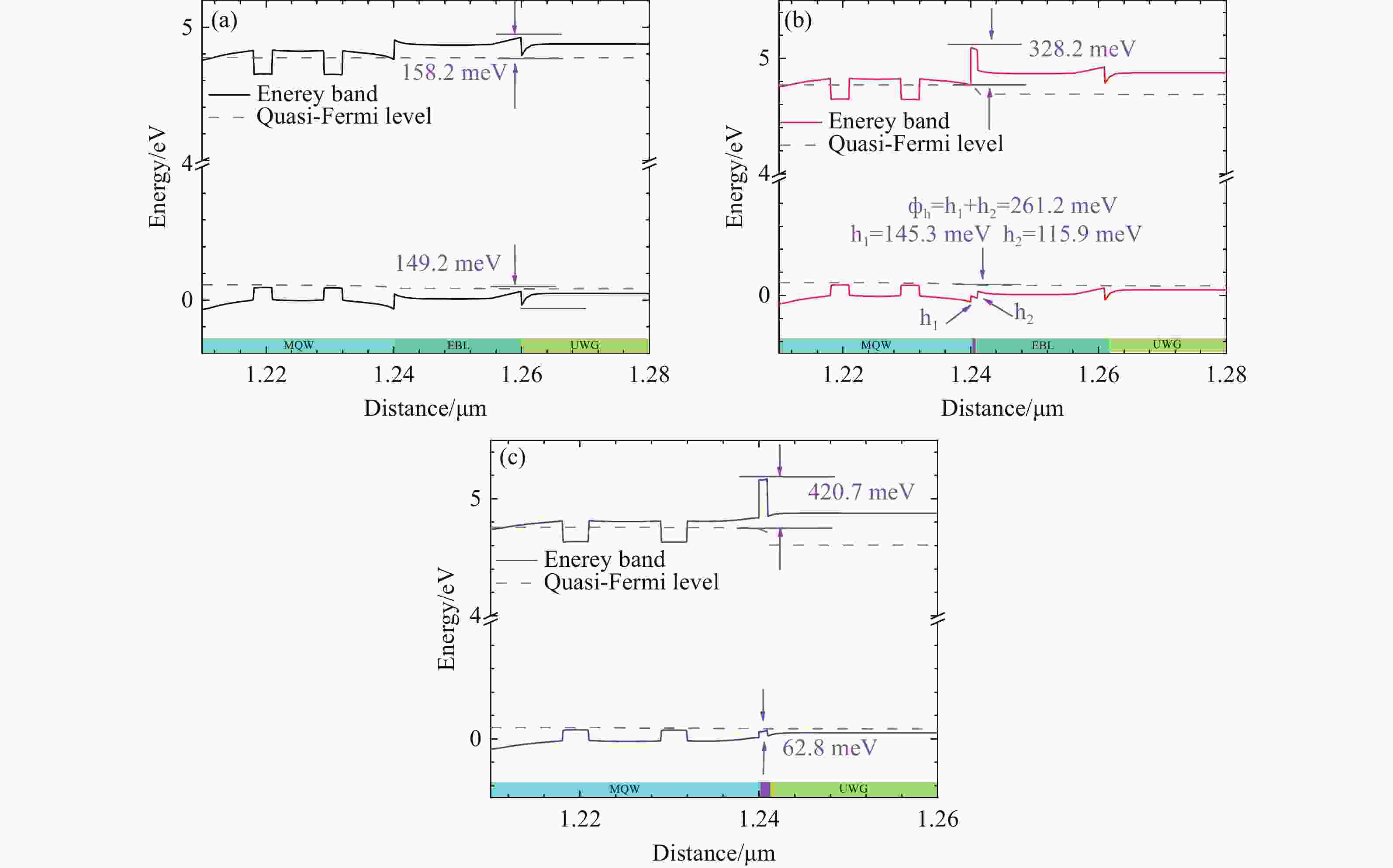 基于氮化铝的深紫外金宝搏188软件怎么用 二极管通常使用电子阻挡层来防止电子泄漏到 p 型区。然而,电子阻挡层也会阻碍空穴注入有源区,导致金宝搏188软件怎么用 效率降低。为了解决这个问题,我们建议在最后一个量子势垒之后使用未掺杂的薄 Al0.8Ga0.2N 条状结构来代替电子阻挡层。研究结果表明,与使用 电子阻挡层 的传统金宝搏188软件怎么用 设计相比,1 nm Al0.8Ga0.2N 带状层可以通过增加有效势垒高度来有效抑制电子泄漏并增强空穴注入。有源区的载流子浓度和量子阱的重组效率提高,进而增加了金宝搏188软件怎么用 器的输出功率。