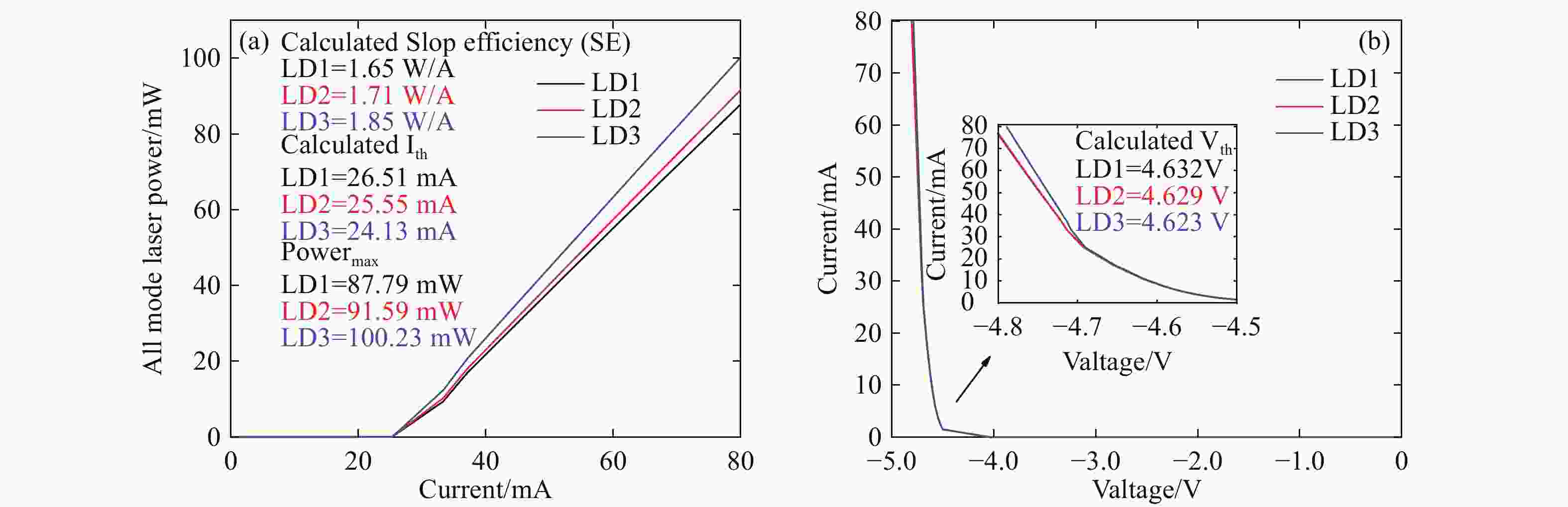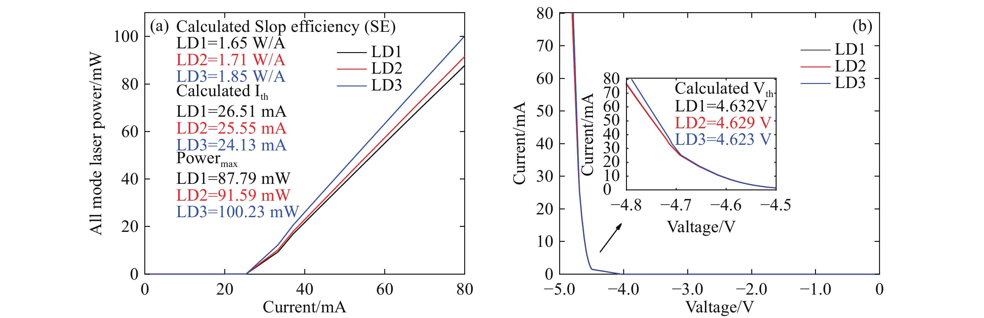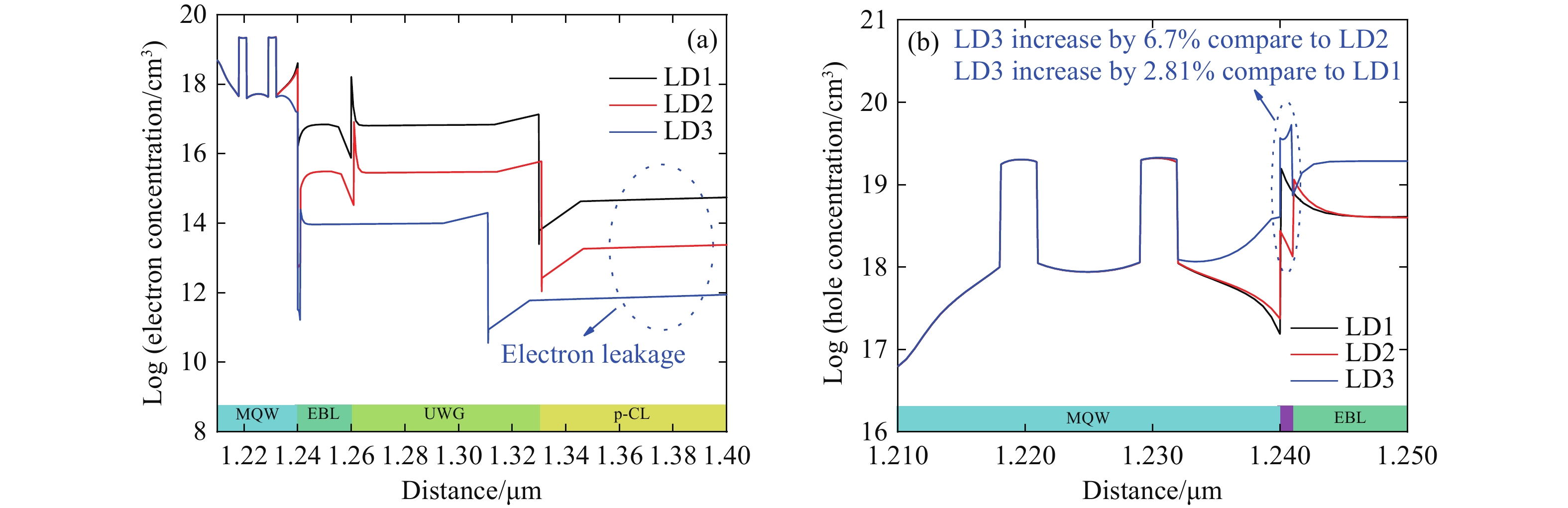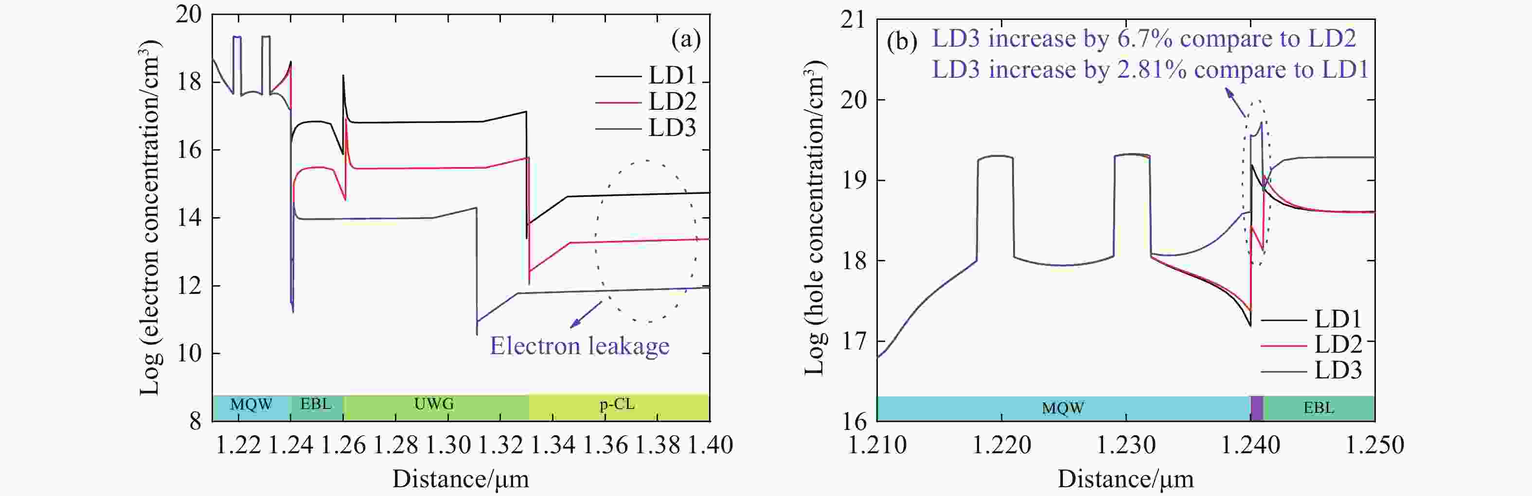 Abstract:AlGaN-based deep-ultraviolet (DUV) laser diodes (LDs) face performance challenges due to electron leakage and poor hole injection, often worsened by polarization effects from conventional electron blocking layers (EBLs). To overcome these limitations, we propose an EBL-free DUV LD design incorporating a 1-nm undoped Al0.8Ga0.2N thin strip layer after the last quantum barrier. Using PICS3D simulations, we evaluate the optical and electrical characteristics. Results show a significant increase in effective electron barrier height (from 158.2 meV to 420.7 meV) and a reduction in hole barrier height (from 149.2 meV to 62.8 meV), which enhance carrier injection and reduce leakage. The optimized structure (LD3) achieves a 14% increase in output power, improved slope efficiency (1.85 W/A), and lower threshold current. This design also reduces the quantum confined Stark effect and forms dual hole accumulation regions, improving recombination efficiency. Our findings present a promising approach for high-performance, EBL-free DUV LDs suitable for high-power applications.