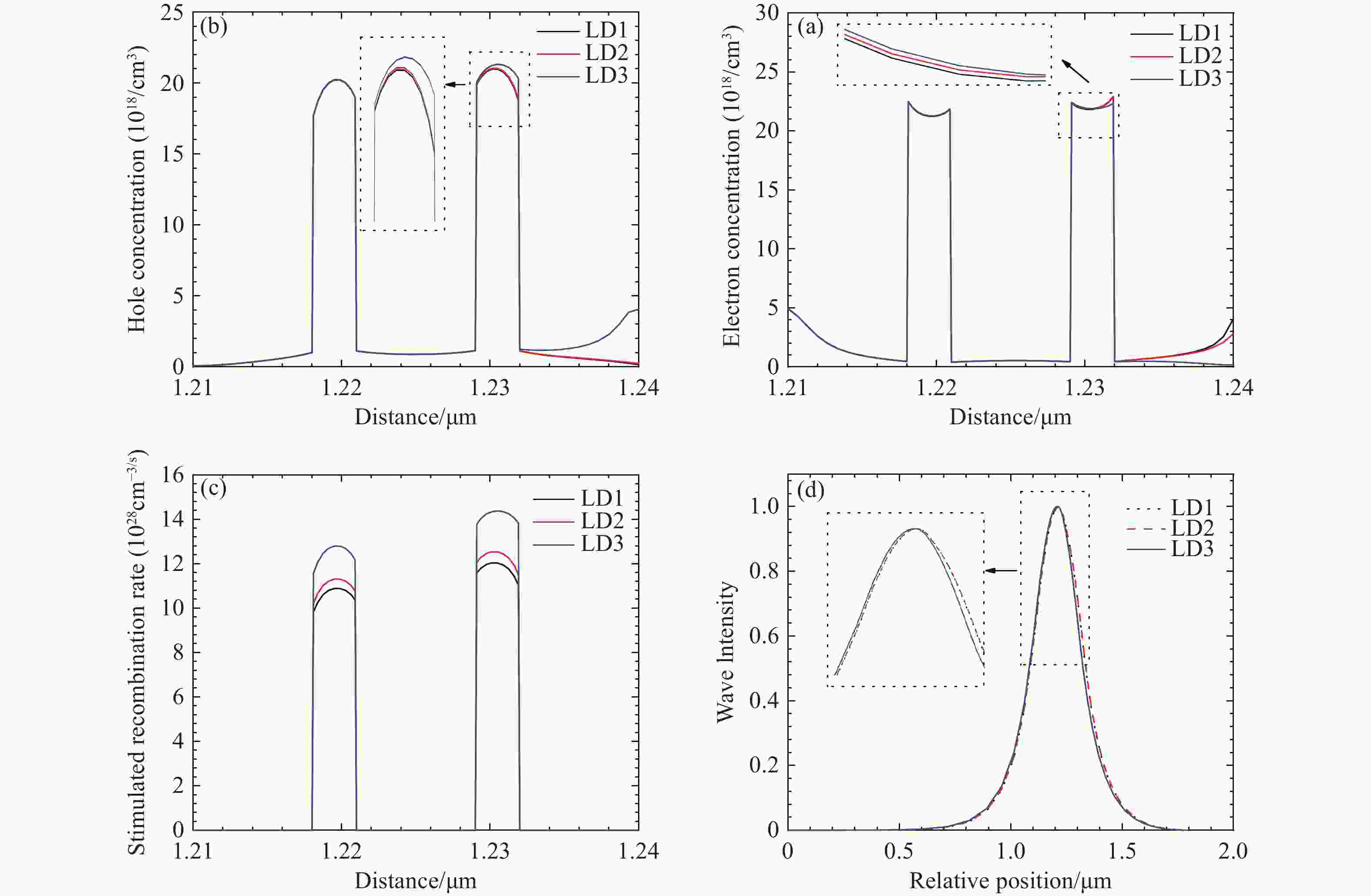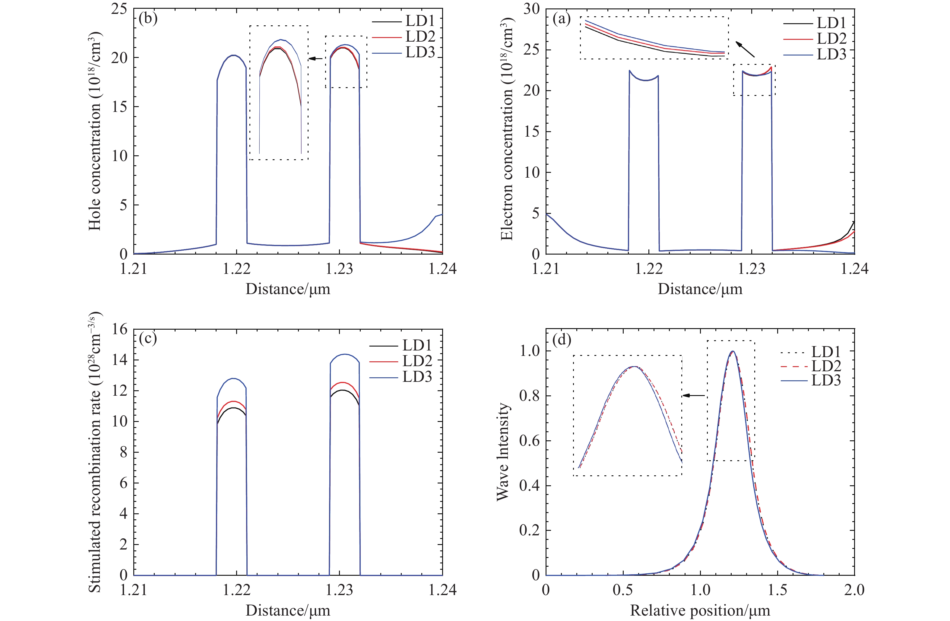 $ {\text{Al}}_{\text{0.8}}{\text{Ga}}_{\text{0.2}}\text{N} $ strip of LD3, and (d) recombination rates with different thickness of Al0.8Ga0.2N strip of LD3 in MQWs -