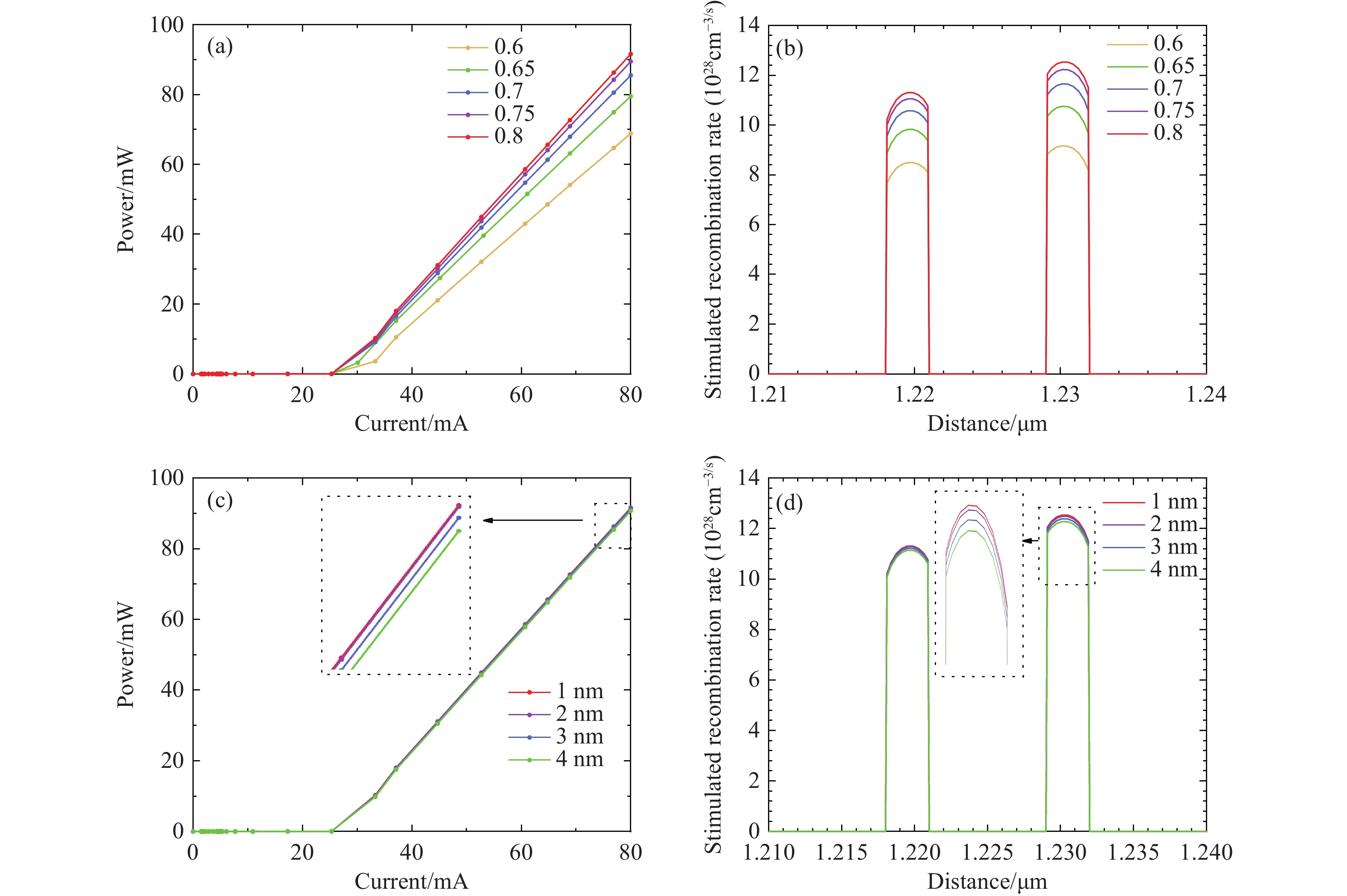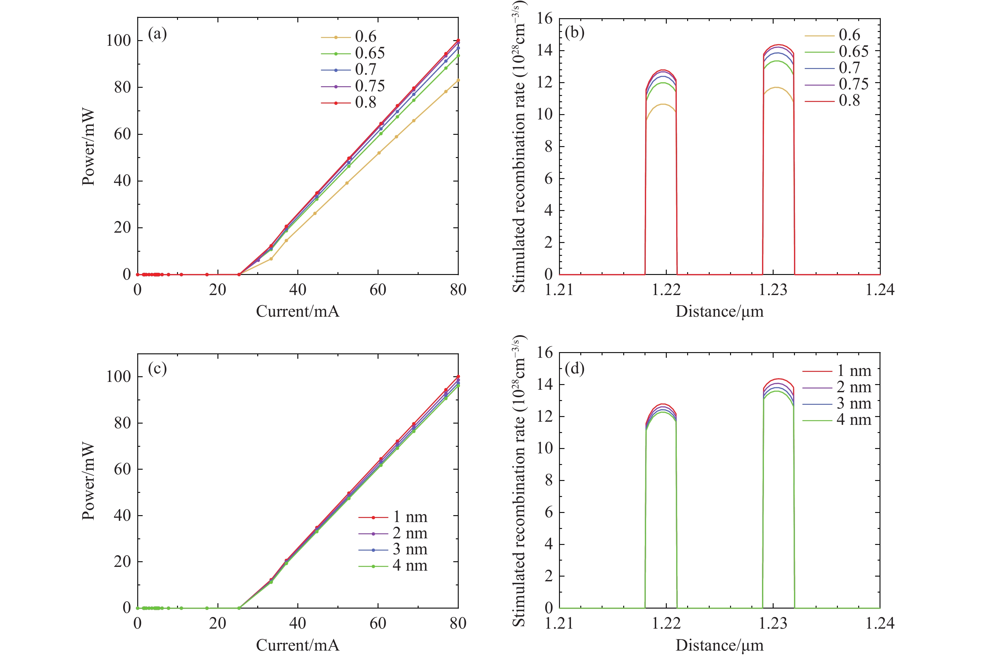 Figure 7. (a) LD2 output power of different Al components, (b) LD2 recombination rates of different Al components in MQWs, (c) output power with different thickness of Al0.8Ga0.2N strip of LD2, and (d) recombination rates with different thickness of Al0.8Ga0.2N