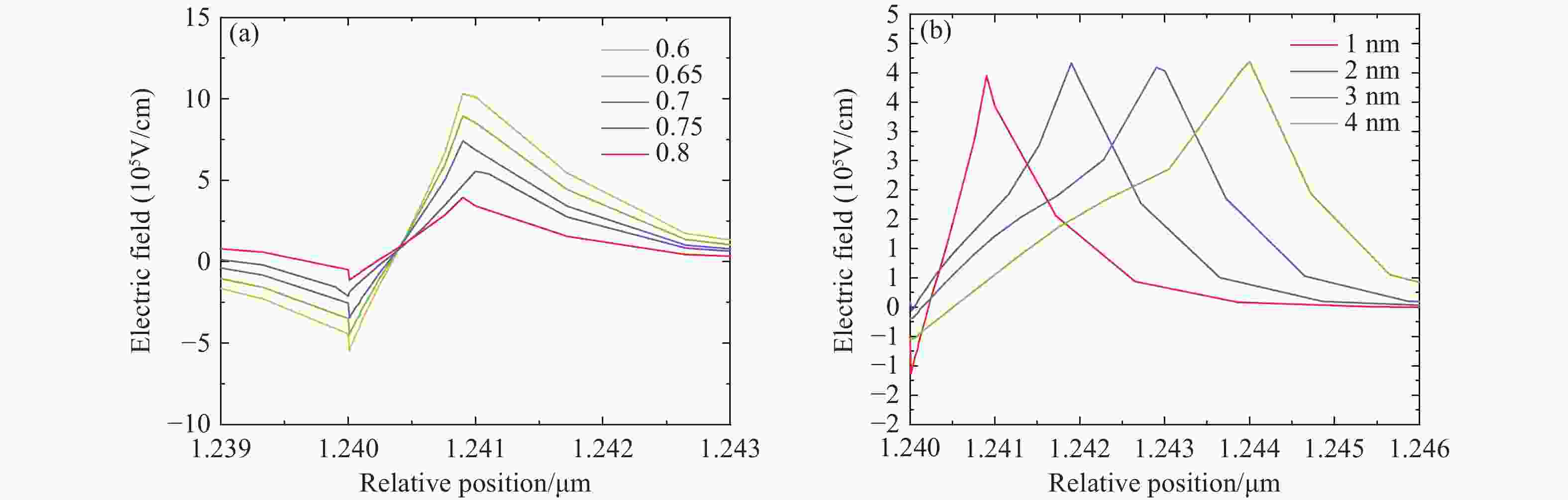 $ {\text{Al}}_{\text{0.8}}{\text{Ga}}_{\text{0.2}}\text{N} $ strip of LD2 in MQWsFigure 8. (a) LD3 output power of different Al components, (b) LD3 recombination rates of different Al components in MQWs, (c) output power with different thickness of Al0.8Ga0.2N