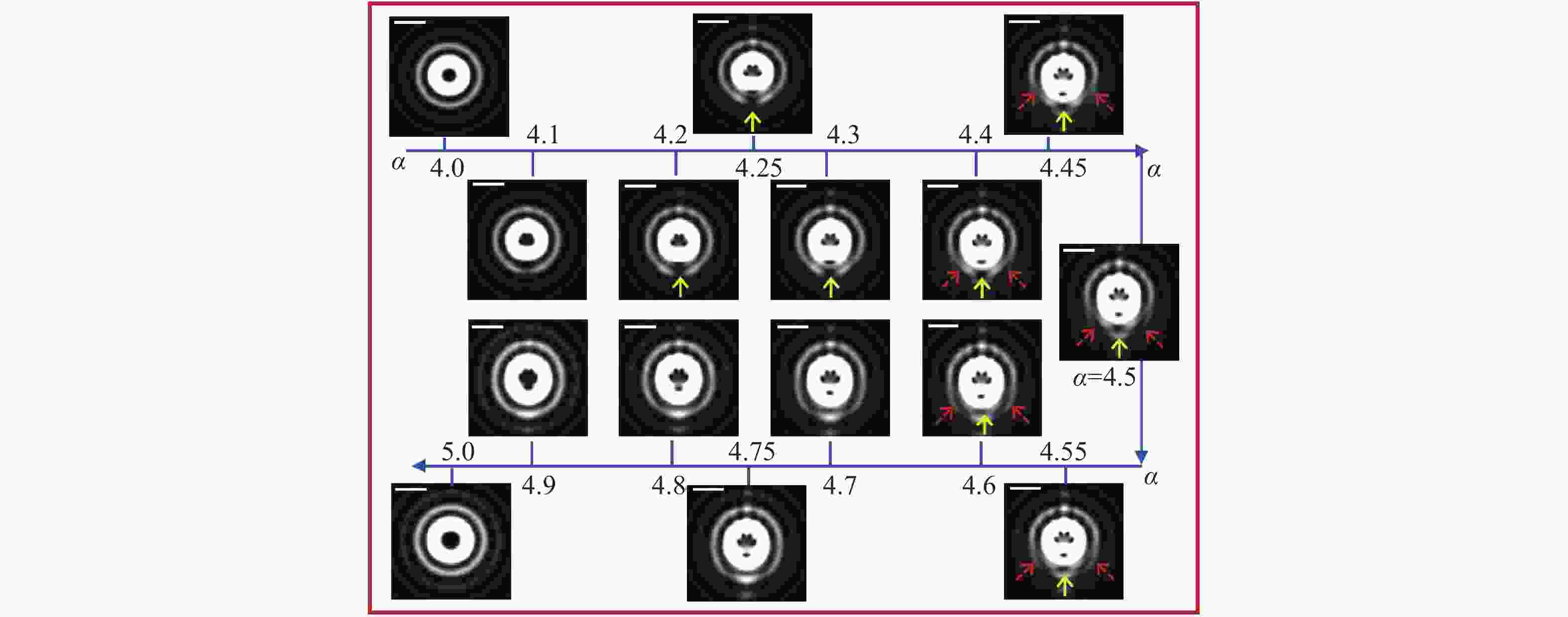 Figure 2.  Magnified inner diffraction patterns of optical vortex with TC changing from α=4.0 to α=5.0 with the separation of 0.1 and 0.05, where the scale bar denotes 1μm.