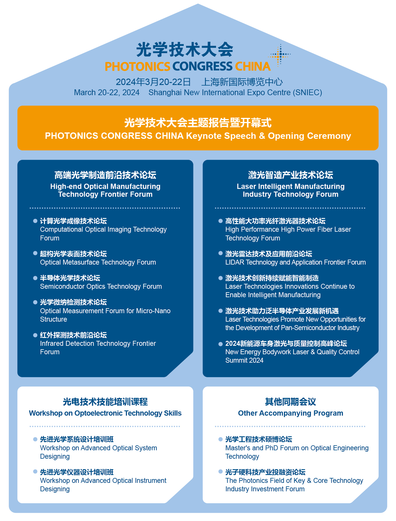 光学技术大会 PHOTONICS CONGRESS CHINA 将与慕尼黑上海光博会共同于2024年3月20-22日在上海新国际博览中心举办。本届大会议题丰富,聚焦行业热点话题,主题包括计算光学成像技术、超构光学表面技术、半导体光学技术、光学微纳检测、红外探测技术、金宝搏188软件怎么用 器、金宝搏188软件怎么用 技术等最新科技研发成果和进展,同时大会将聚焦半导体、新能源、汽车工程、人工智能、生物医疗等应用场景,更有多个光学主题培训班的加入,为光电人带来更多专业课程。