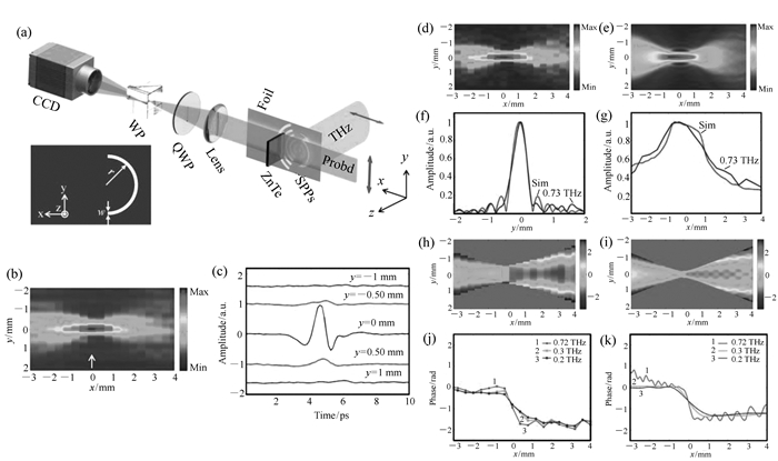 图 8 金属等离子体器件的太赫兹表面波再现。(a)实验系统图,插图展示了测试样品;(b)太赫兹表面波时域峰值图像;(c)在x=0 mm方向上y=-1 mm、-0.5 mm、0 mm、0.5 mm、1 mm位置处的太赫兹时域信号;(d)0.73 THz太赫兹表面波的振幅分布图;(e)利用FDTD算法得到的模拟结果;(f)和(g)展示了归一化横向和纵向振幅轮廓曲线;(h)0.73 THz表面太赫兹波的相位分布图;(i)相应的模拟结果;(j)不同光谱成分太赫兹表面波的纵向相位轮廓曲线;(k)相应的模拟结果