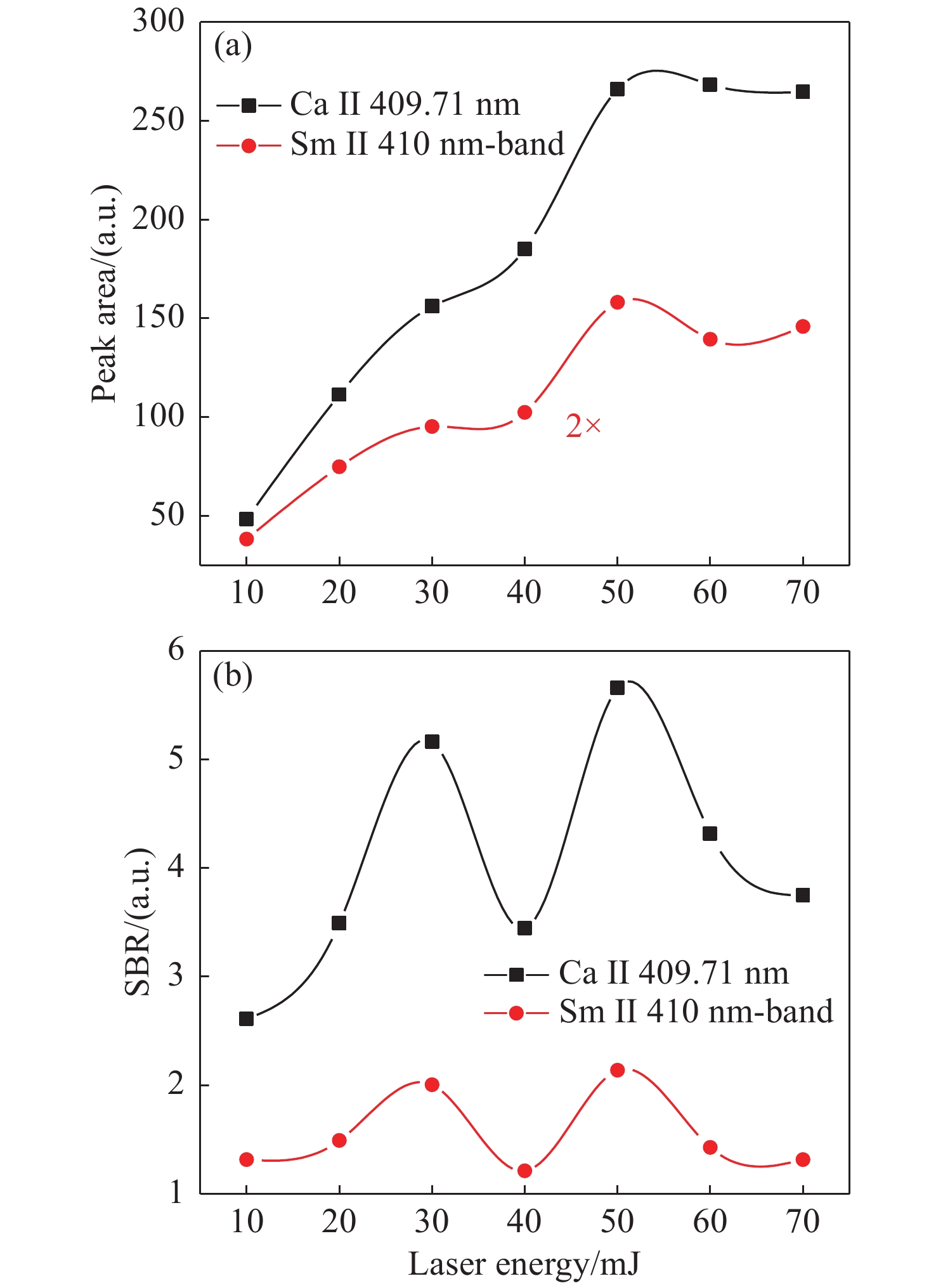 能量参数对谱线强度和信背比的影响,得出最优化的实验条件后,对所有待分析样品进行激发以获取等离子体光谱信息。接着,分别采用多峰Lorentz拟合扣除背底法(MFM)和级联积分保留背底法(CIM)对光谱信息进行处理,构建以谱线积分强度与元素含量为关联量的定标曲线。最后,根据定标曲线进行含量预测,初步评估了LIBS用于稀土矿区土壤样品中Sm元素的检测性能。研究结果表明:受稀土矿区土壤基体效应的影响,Sm元素的谱线出现了强烈的展宽而导致无法进行有效分辨,而钠(Na)、钾(K)、钛(Ti)和铁(Fe)等元素的谱线没有呈现出明显的展宽。通过对比不同含量下的光谱信息,选取410 nm-band和470.44 nm为Sm元素分析谱线用于定量分析。基于积分强度和元素含量构建的定标曲线都有着较好的线性相关度,拟合系数(