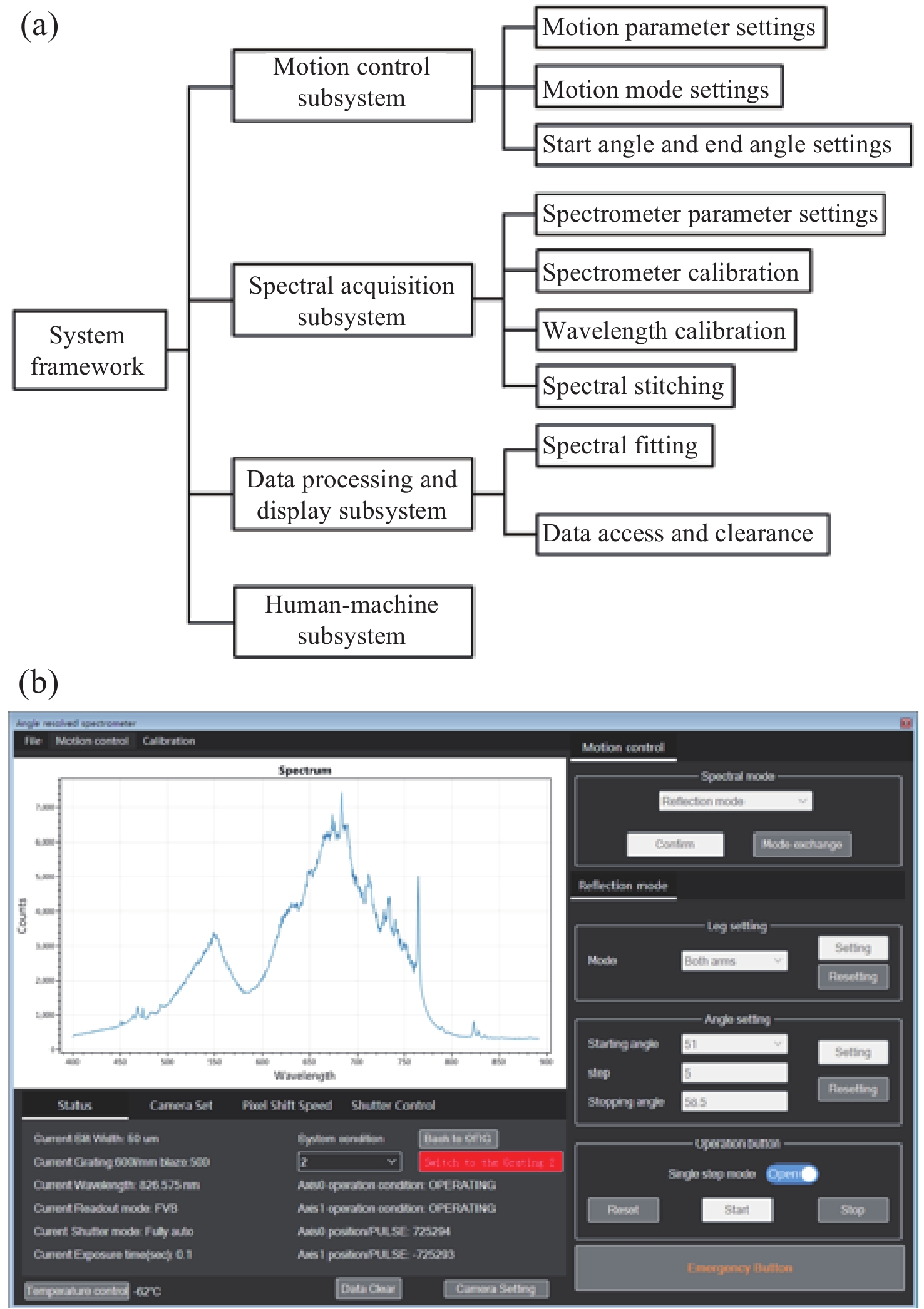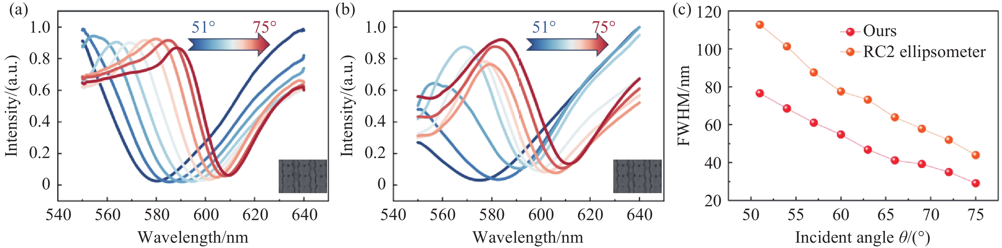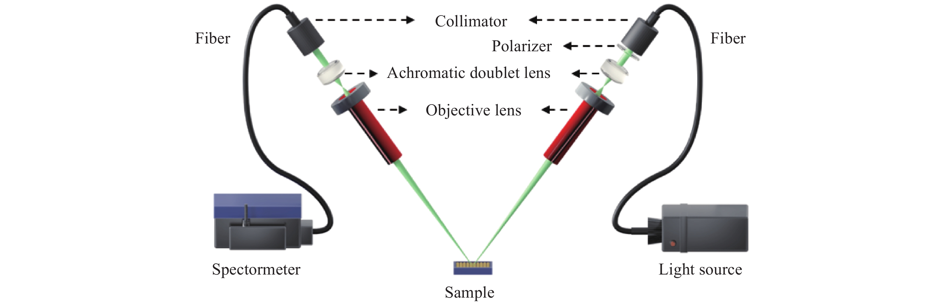 为研究表面等离激元纳米结构的微区域光学响应,本文研制了一套基于同轴转臂的微区域角分辨光谱测量系统。该系统设计了一种基于有限共轭构型的微区域远程激发与收集光路模型,实现了以32 μm直径的微区域光斑入射;搭建了基于同轴转臂的角分辨机械系统,实现了6.9° 至90° 的大范围定向角度激发。性能测试表明,系统稳定性高,最小角度分辨率达0.12°。通过对一维光栅和二维周期纳米结构的反射光谱采集实验,进一步验证了系统的可靠性,证明了微区域光斑所带来的优势,为微纳结构的角分辨光谱表征提供了有效的技术手段。