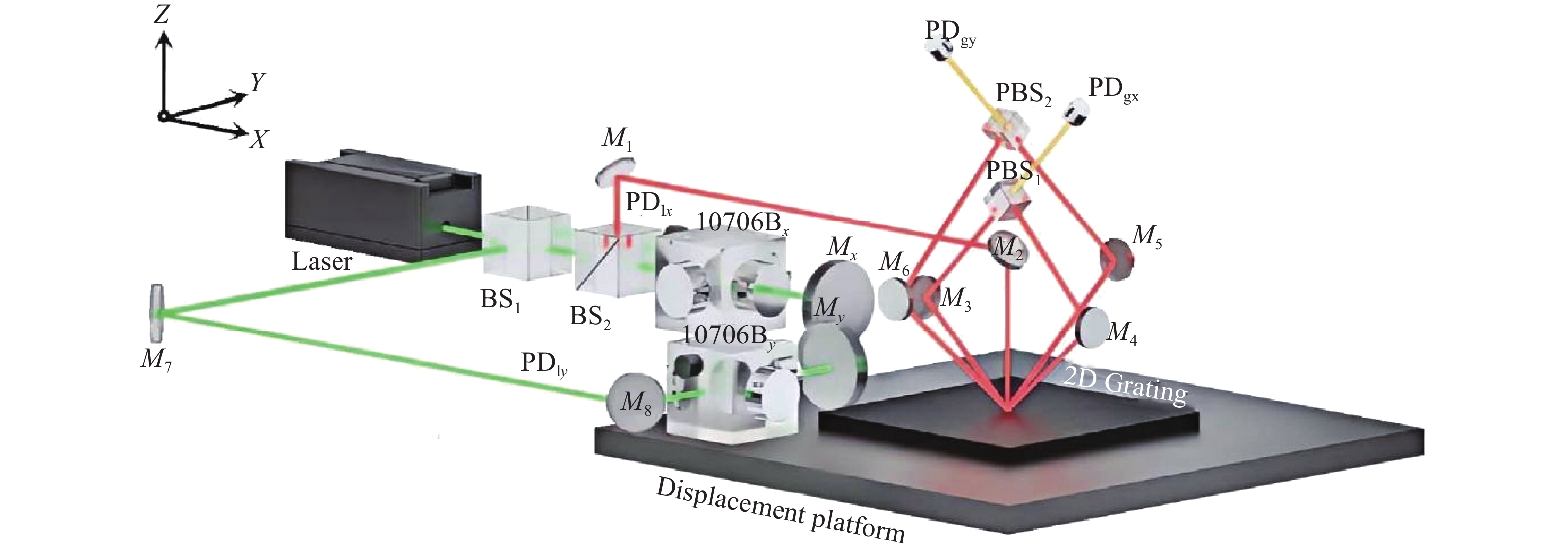 二维光栅是平面光栅干涉仪实现高精度、多维位移测量的核心器件,其刻线密度和栅线正交性误差的检测与标校,一方面可提高光栅干涉仪的定位精度,另一方面可为二维光栅的制作提供反馈指导。本文提出一种利用正交外差金宝搏188软件怎么用 干涉仪同时标定二维光栅刻线密度和栅线正交性误差的方法,以待测光栅搭建二维光栅干涉仪,双轴金宝搏188软件怎么用 干涉仪为其提供位移参考,建立光栅干涉与金宝搏188软件怎么用 干涉的相位映射关系,通过任意两次位移获取的干涉相位信息,即可解算上述3项参数,同时又可获取光栅安装误差。使用1200 gr/mm的二维光栅验证了提出方法的可行性,X、Y方向刻线密度的标准差分别为0.012 gr/mm和0.014 gr/mm,栅线正交性误差的标准差为0.004°,安装误差标准差为0.002°。与原子力显微镜法进行了精度比对,X、Y方向刻线密度的一致性优于0.03 gr/mm、0.06 gr/mm,正交性误差优于0.008°。实验结果表明,本文提出的方法可简单、高效的应用于二维光栅的栅线参数标定。
