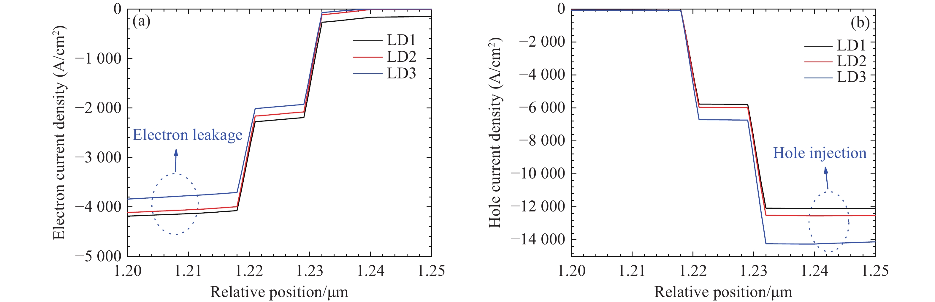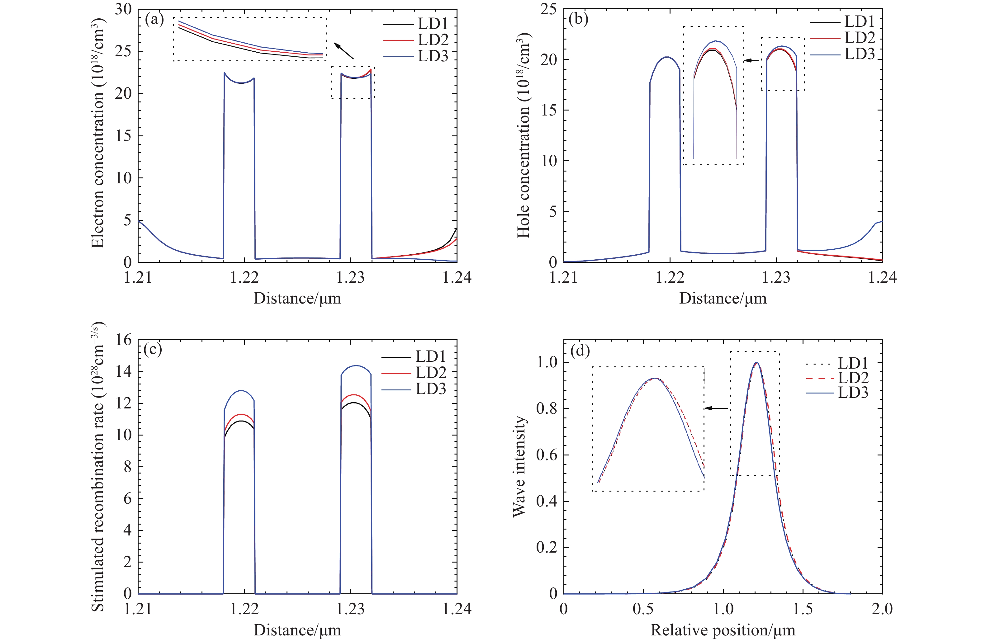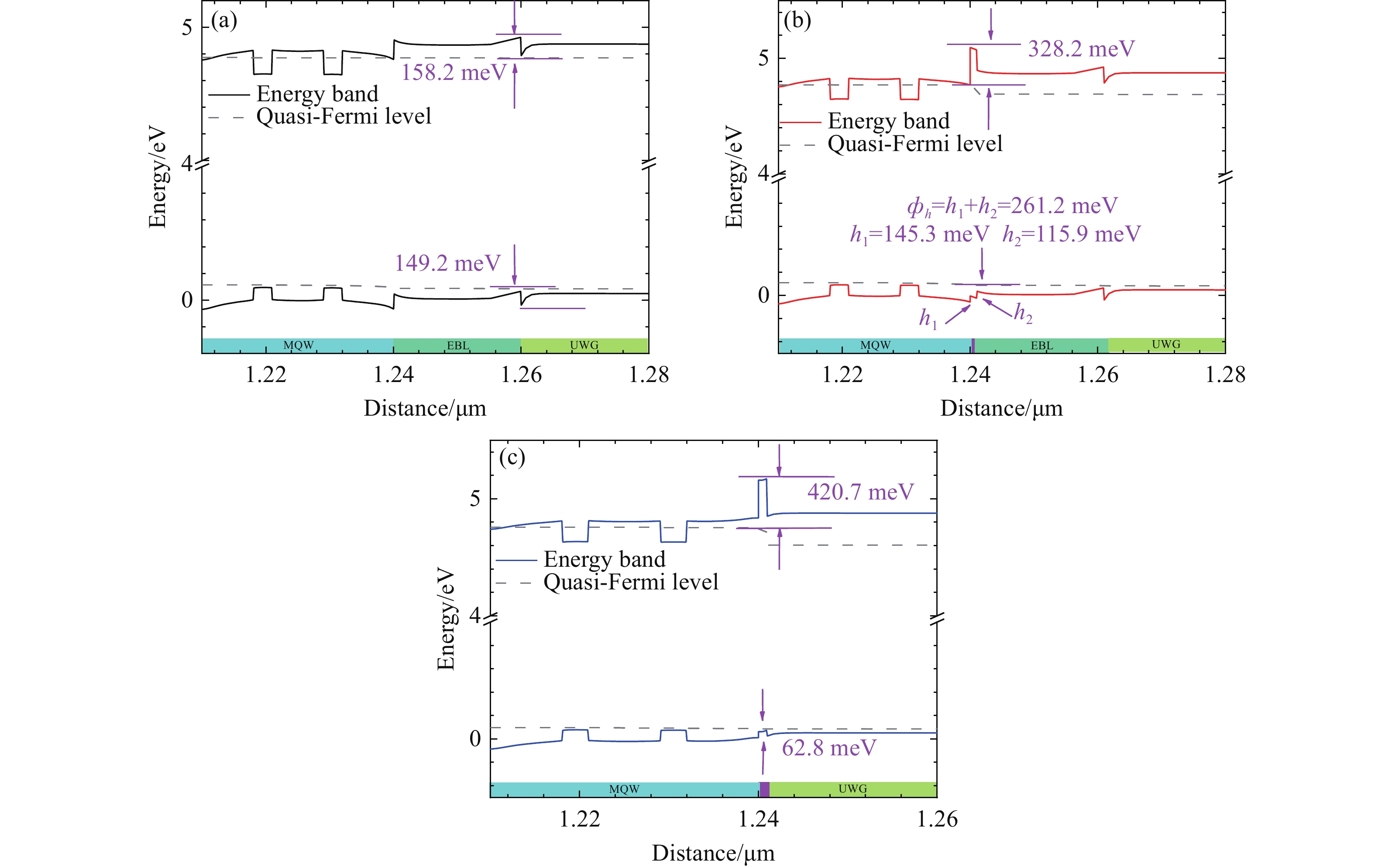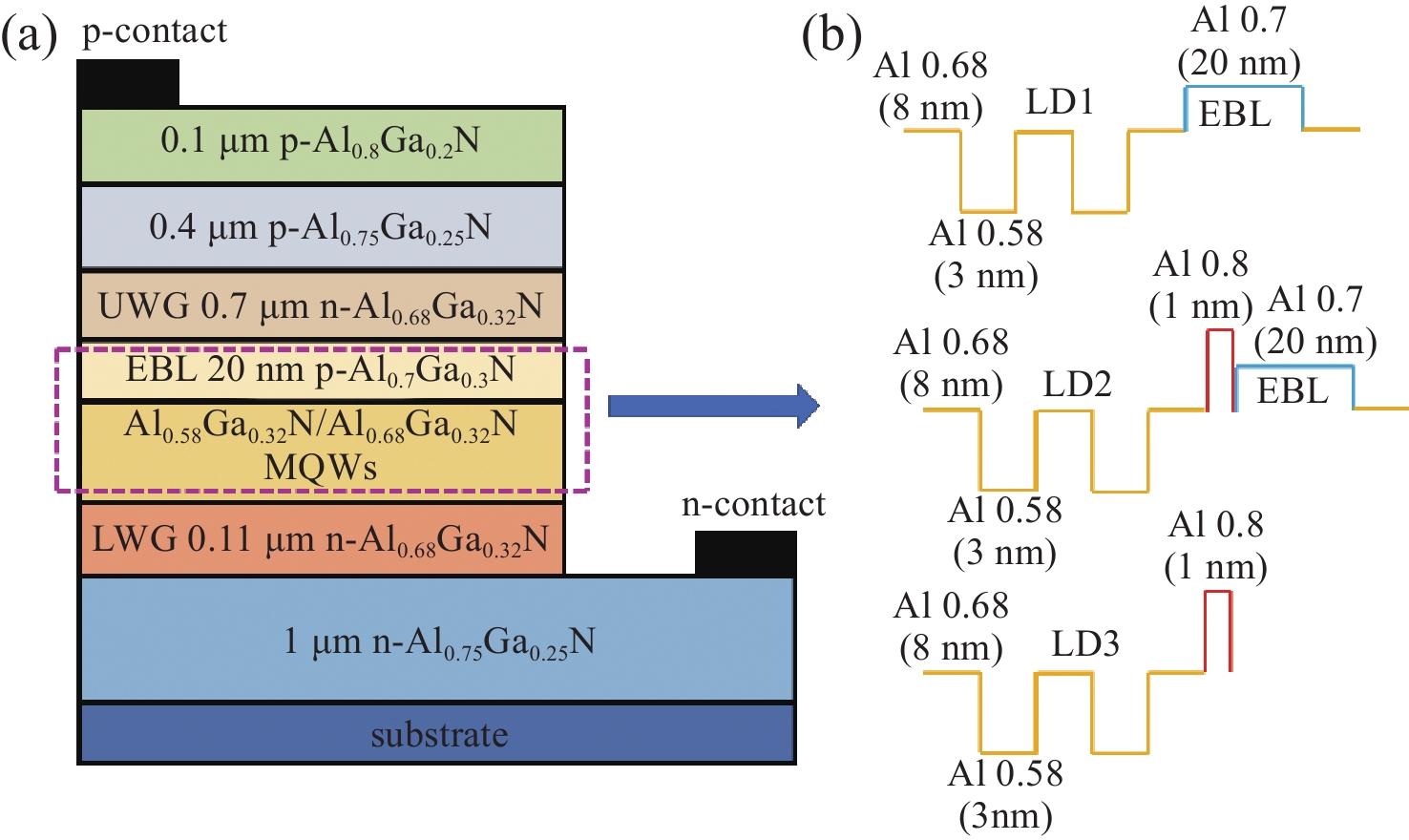 基于AlGaN的深紫外金宝搏188软件怎么用 二极管因电子泄漏和空穴注入效率低下而面临性能挑战,且传统电子阻挡层的极化效应会加剧这些问题。为克服这些限制,本文提出了一种无电子阻挡层的深紫外金宝搏188软件怎么用 二极管设计方案,在最后一个量子阱之后引入了一层1 nm厚的未掺杂Al0.8Ga0.2N薄条状层。通过PICS3D仿真,本文评估了其光学和电学特性。结果表明,有效电子势垒高度显著增加(从158.2 meV增至420.7 meV),而空穴势垒高度则从149.2 meV降至62.8 meV,这增强了空穴注入并减少了电子泄漏。优化后的结构(LD3)输出功率提升了14%,斜率效率提高至1.85 W/A,而且降低了阈值电流。该设计还减弱了量子局域斯塔克效应,并形成了双空穴积累区,从而提高了复合效率。本文的研究成果为适用于高功率应用的高性能、无EBL深紫外金宝搏188软件怎么用 器提供了一种极具前景的解决方案。
