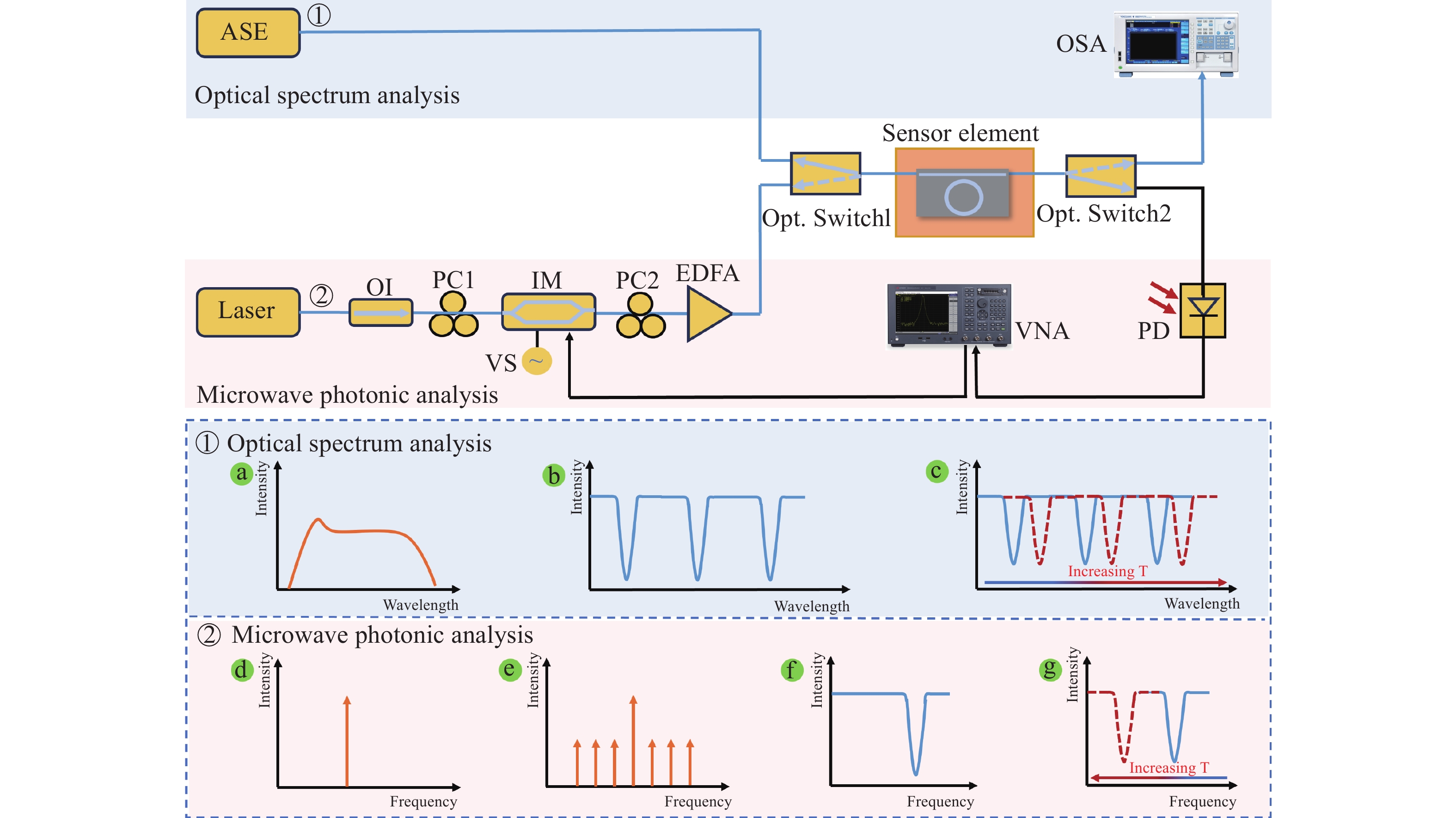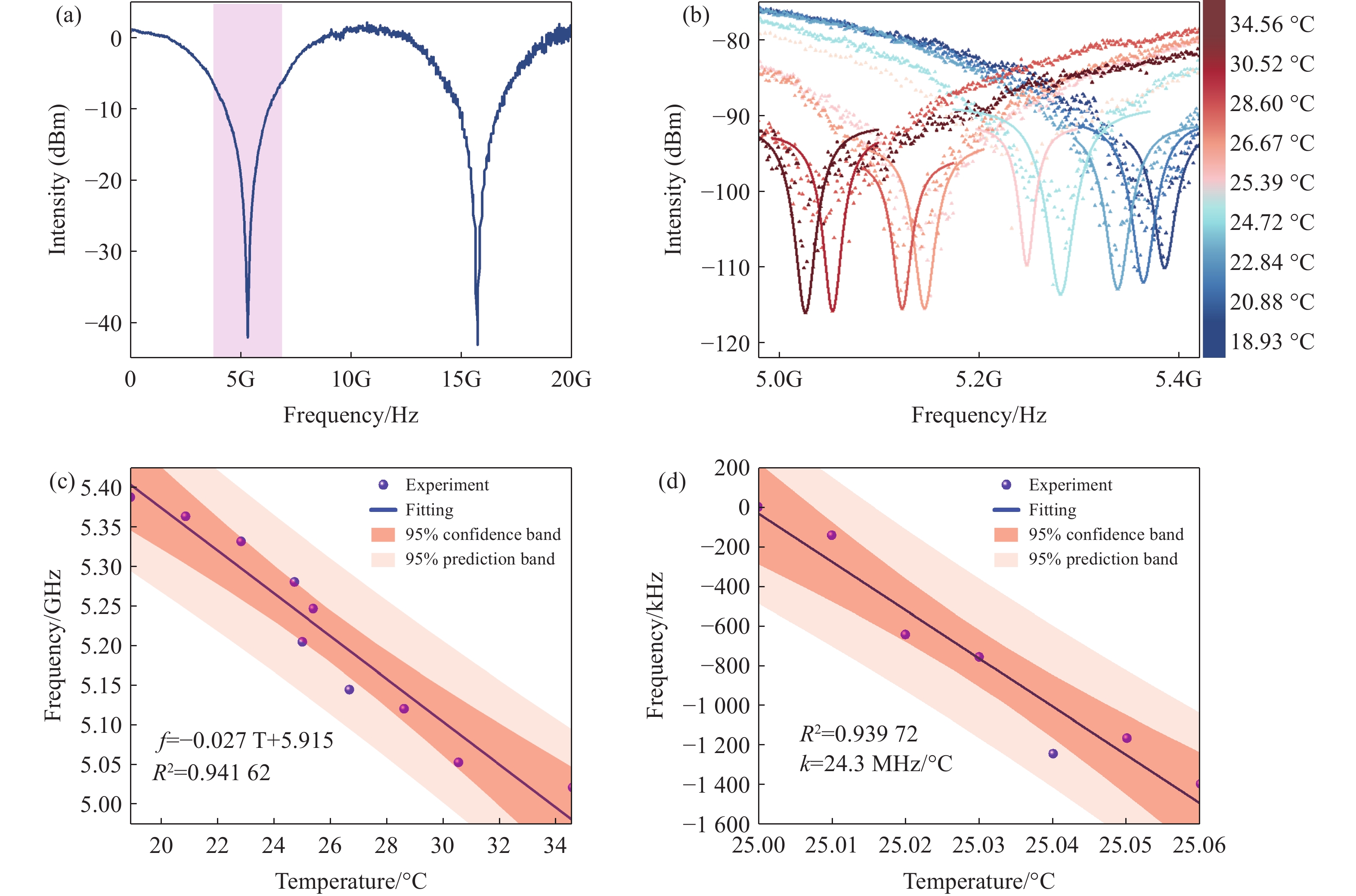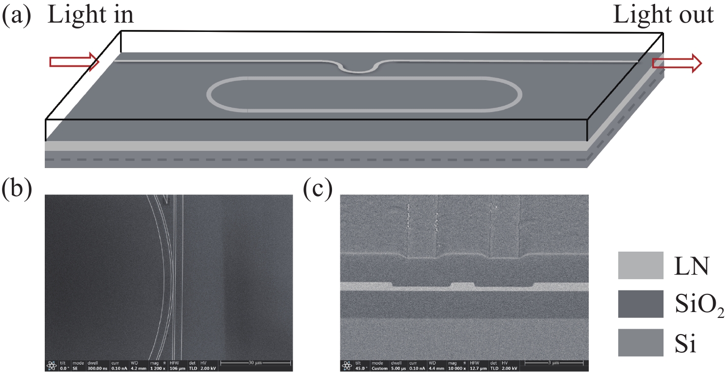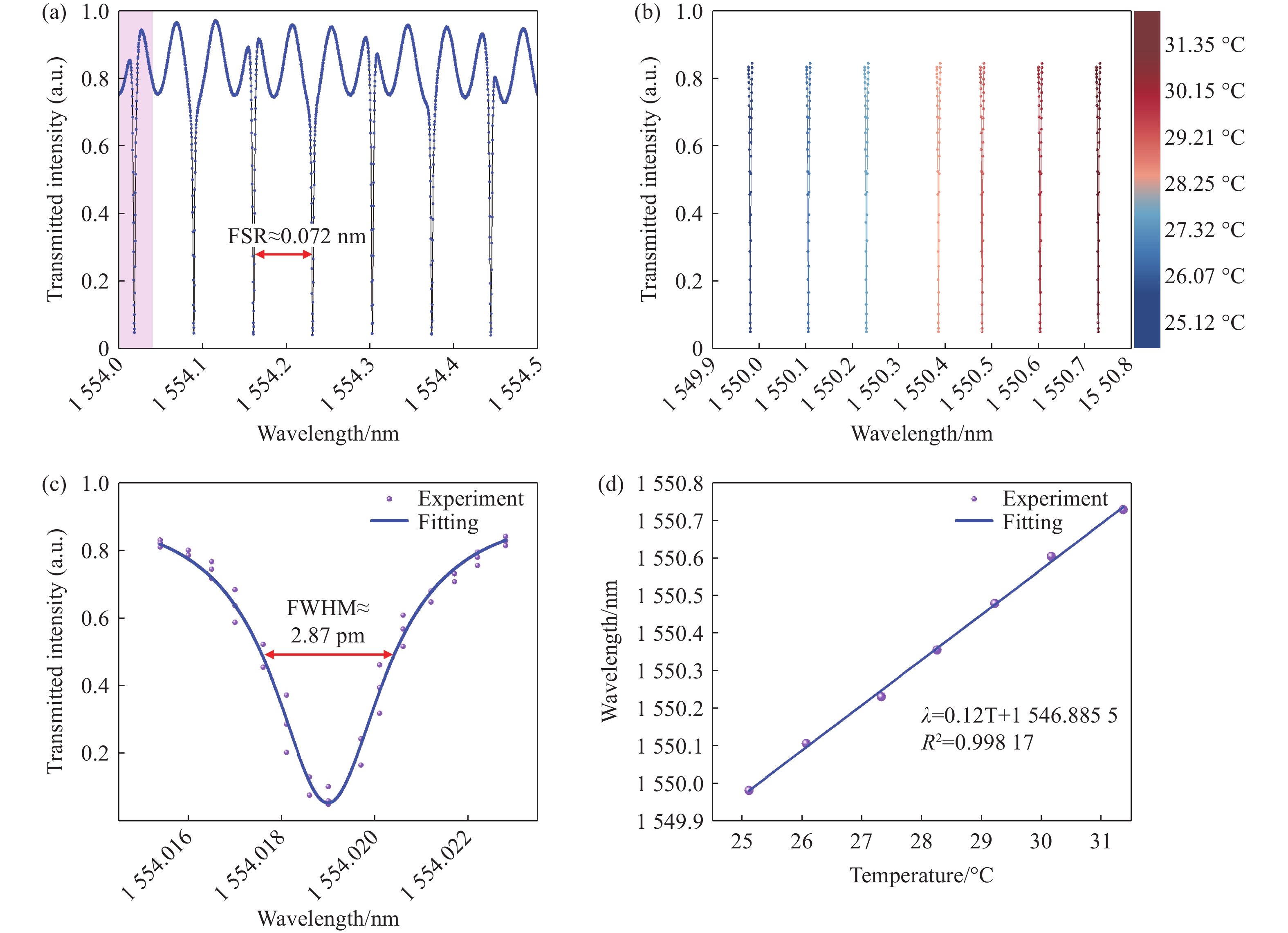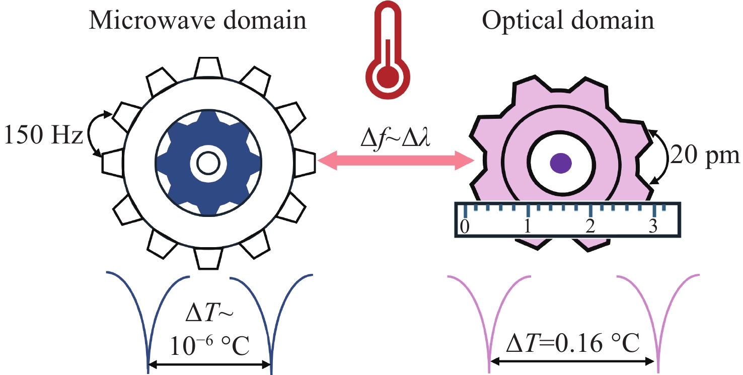 为实现高精度温度传感,本文提出了一种基于高品质因子薄膜铌酸锂微环谐振器与微波光子读取技术的温度传感器。该系统中,薄膜铌酸锂微环谐振器(线宽为2.87 pm,Q值高达105)同时作为温度感知单元和微波光子滤波器的核心处理部件,利用热光效应将温度变化转换为光学谐振波长偏移,并创新性地借助微波光子技术将其线性映射为微波通带频率变化,采用矢量网络分析仪对微波频率响应进行精确探测,通过高精度频率响应变化实现温度测量,最终建立了温度与频率偏移量之间的定量关系模型。与传统直接检测光学波长变化的方法相比,微波光子学读取技术通过将微小的光学谐振波长偏移量线性地转换为微波通带中心频率的变化,突破了光谱仪固有的波长检测分辨率限制。实验结果表明,传感器灵敏度达27 MHz/°C,分辨率可达0.002 °C,在0.01 °C实验温度变化条件下,保持良好的线性响应。本研究有效解决了传统光学测温中灵敏度与分辨率之间的权衡问题,为片上集成高精度温度传感提供了新方案。