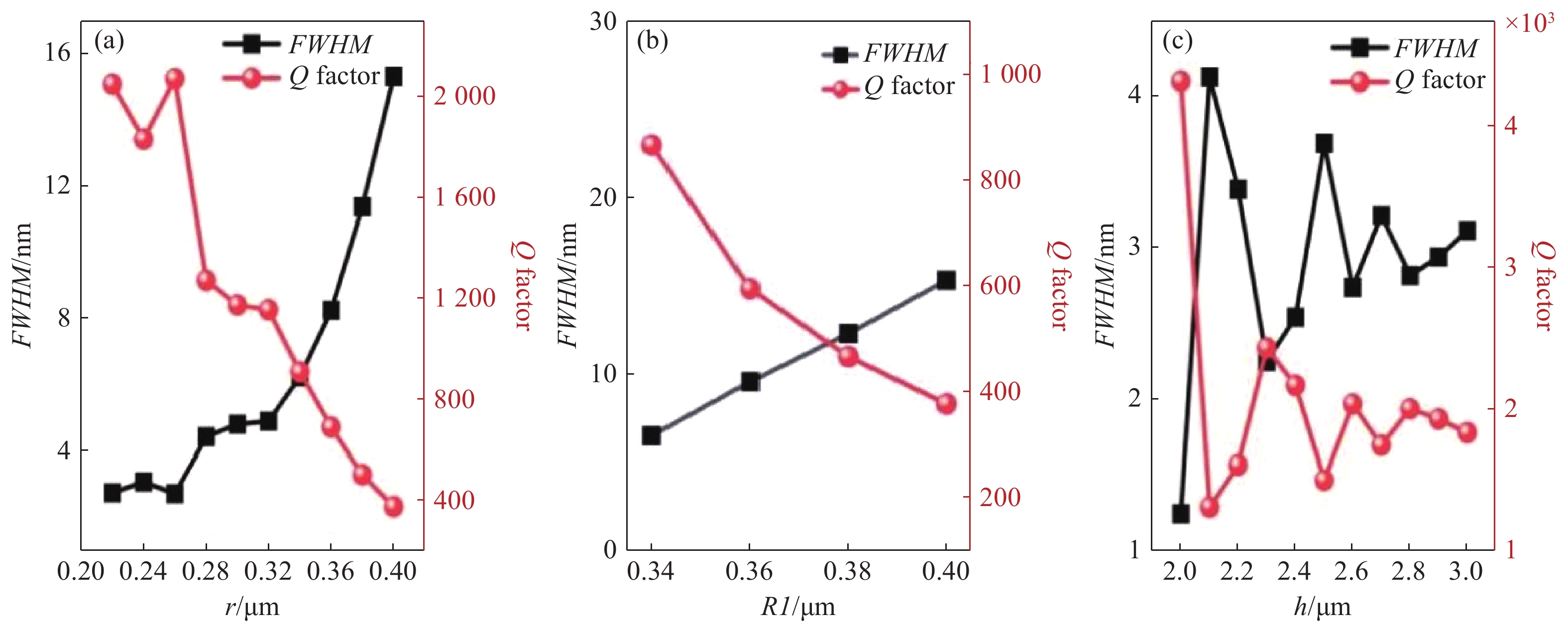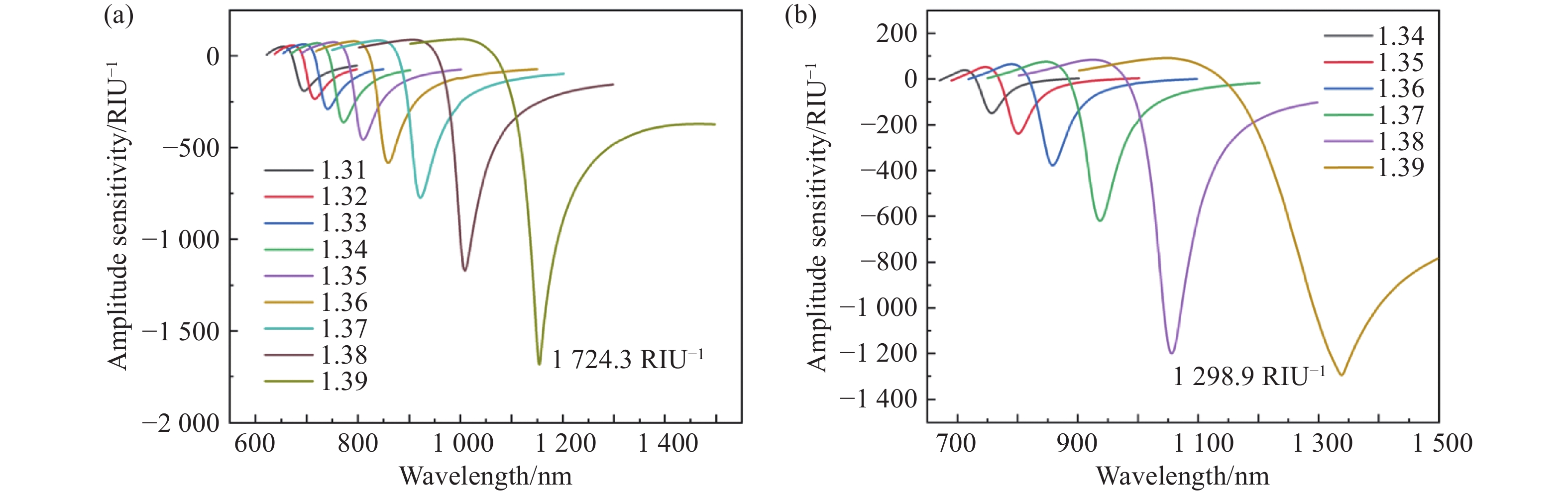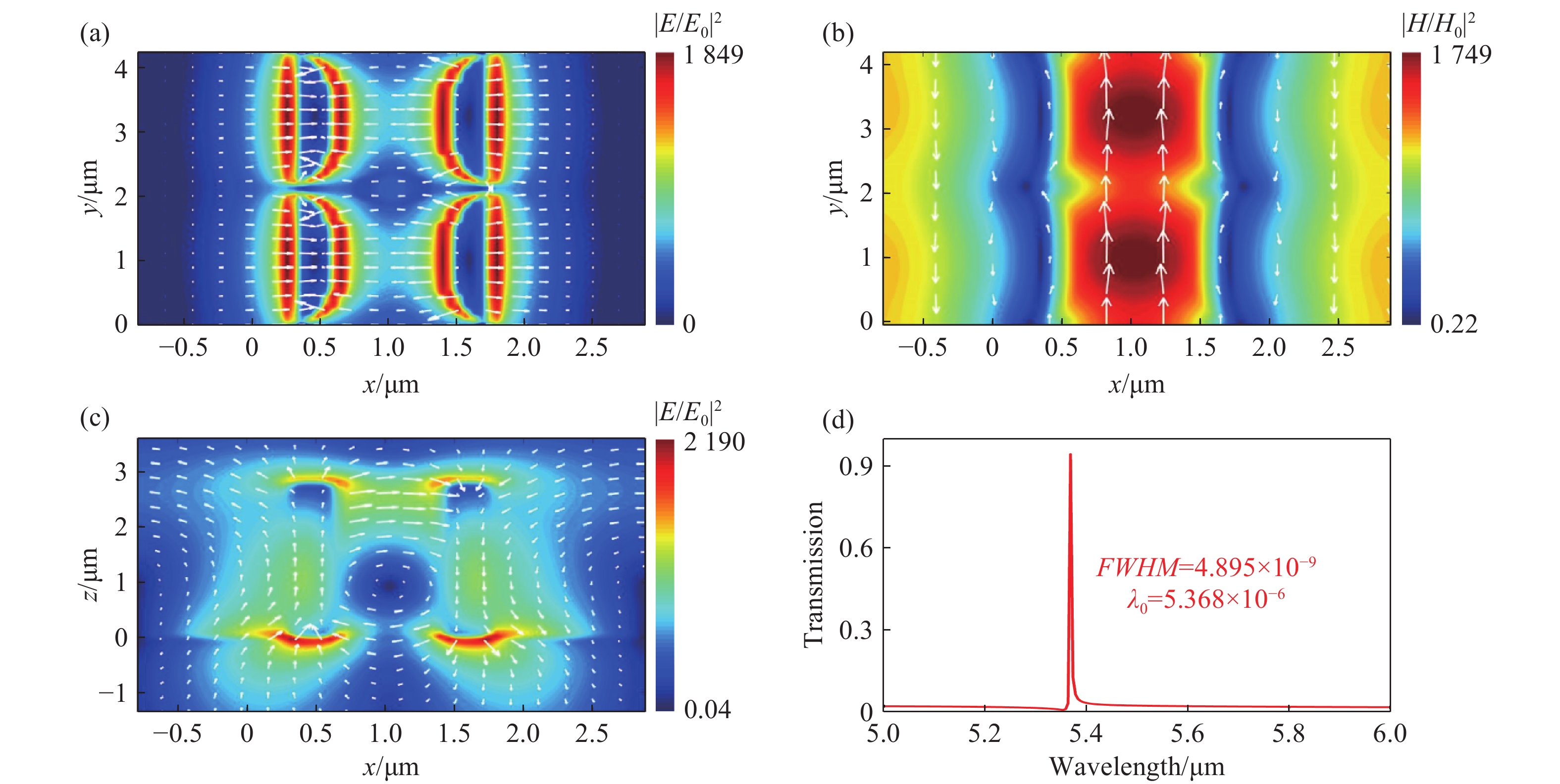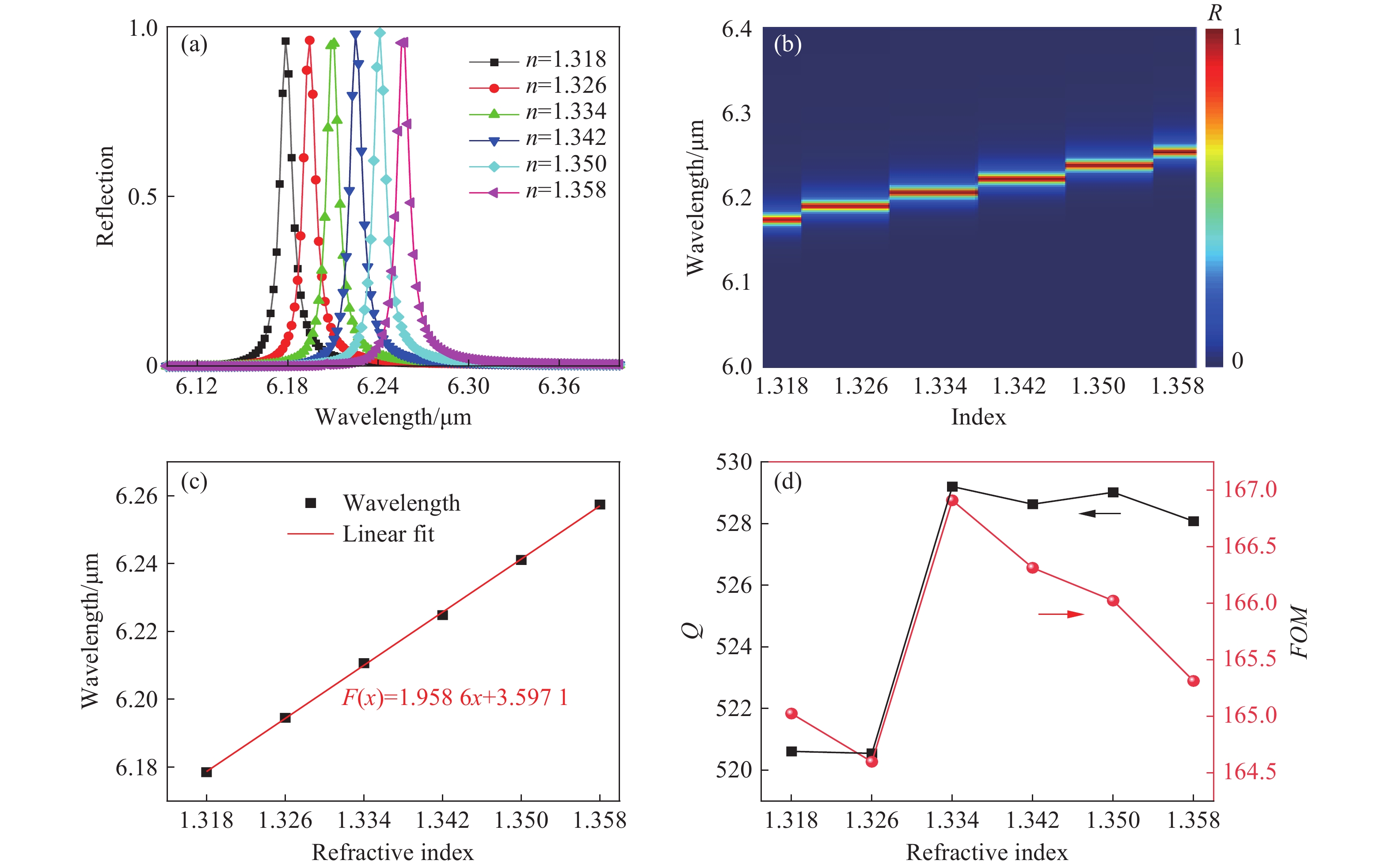 本文提出一种基于全介质超表面的高性能中红外折射率传感器,工作波长约为5.36 µm。超表面单元结构由四个对称分布的Sb2Se3半椭圆结构与一个中心Sb2Se3圆柱体周期性排列构成,以BaF2为衬底。采用时域有限差分法进行数值模拟,获得结构的反射光谱。进一步分析共振峰处的电磁场矢量分布,并探究几何参数对光谱的影响。反射光谱中观察到的法诺共振现象通过准连续域束缚态理论予以解释。通过对几何参数进行系统性扫描,重点考察在固定谐振峰强度条件下,各结构参数对器件品质因子与半高全宽的影响规律,比较不同方向调整参数时光谱线宽的响应差异。进一步通过改变背景折射率,研究了基于法诺共振的折射率传感特性。结果表明,该传感器最高灵敏度达1985 nm/RIU,最大品质因子为1096.6,优值达400。与现有报道的中红外折射率传感器相比,在灵敏度、品质因子及优质等关键性能上均展现出明显优势。本文研究为发展基于硫系化合物的高性能中红外光学传感器提供了有效的设计思路与性能参考。