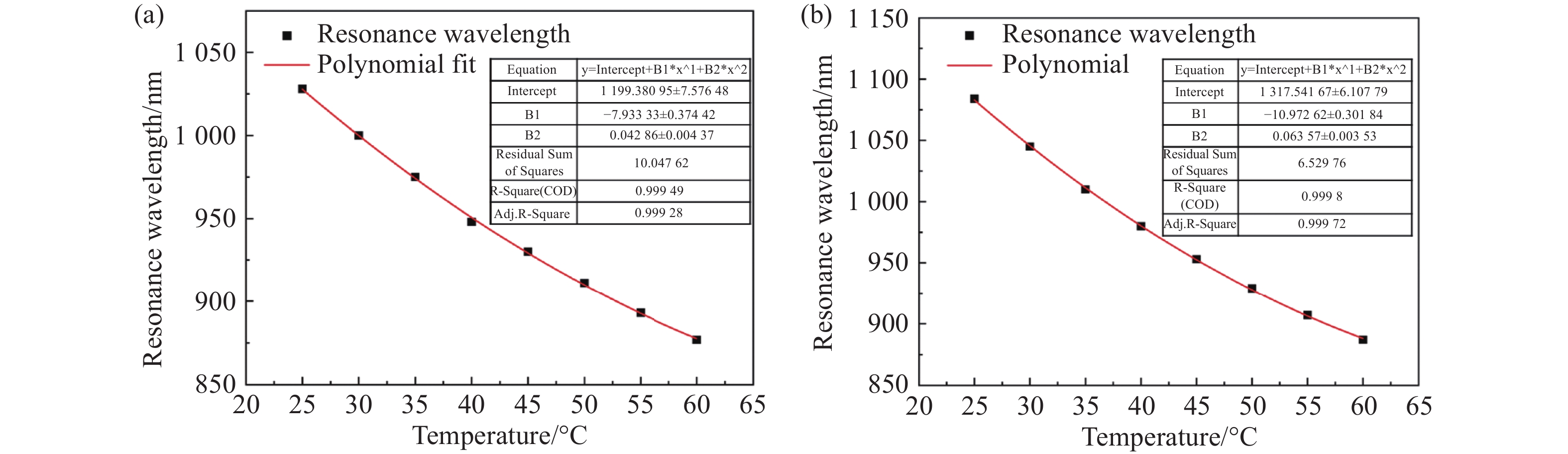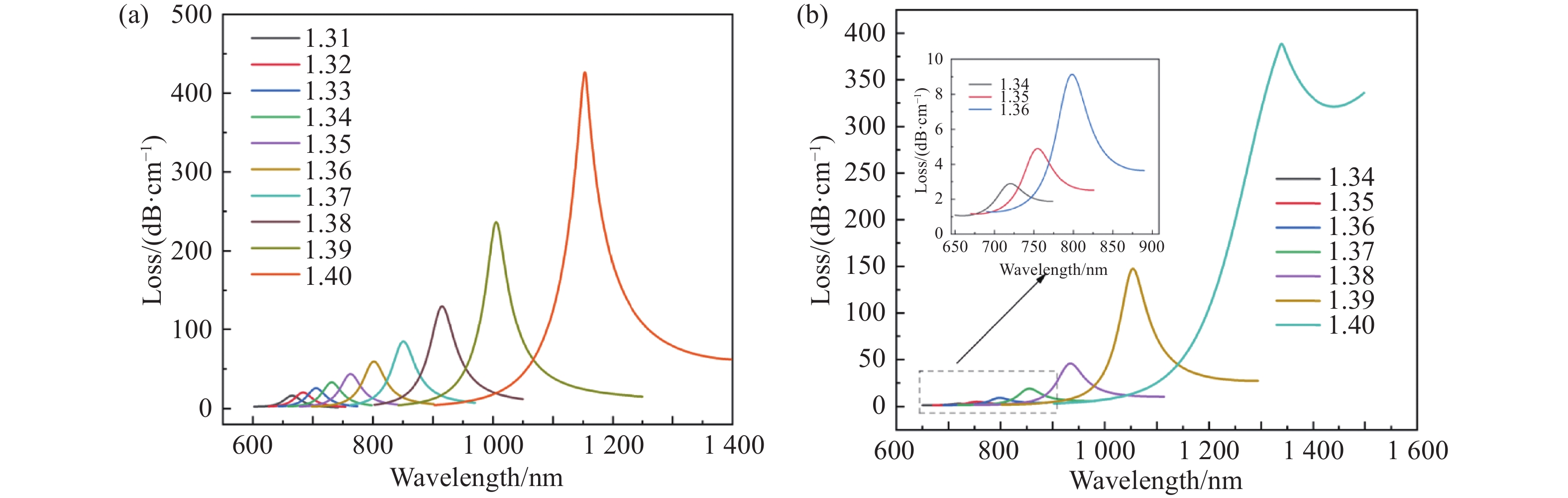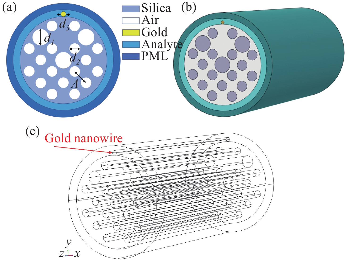 针对现有光子晶体光纤表面等离子体共振(PCF-SPR)传感器存在的金属薄膜涂覆工艺复杂、单参数检测集成度低等问题,本文提出一种基于金纳米线集成偏置芯PCF-SPR的双参数传感器。该传感器突破传统孔内镀膜或金属薄膜结构,通过化学气相沉积(CVD)将金纳米线直接附着于光纤包层,避免了镀膜不均问题并显著简化制备工艺。通过优化非对称偏置芯光纤结构并利用金纳米线的强局域场增强效应,该传感器在双偏振模式下实现了温度(25~60 °C)与折射率(1.31~1.40)的高灵敏度同步检测。仿真实验表明:x偏振模式可实现1.31~1.40折射率检测,最大波长灵敏度与振幅灵敏度分别达14800 nm/RIU和−1724.25 RIU−1,最高折射率分辨率为6.75×10−6 RIU;y偏振模式折射率检测范围达1.34~1.40,最大波长灵敏度与振幅灵敏度分别为28400 nm/RIU和−1298.93 RIU−1,最高折射率分辨率为3.52×10−6 RIU。在25~60 °C温度传感中,传感器表现出7.8 nm/°C的波长灵敏度与1.38×10−6 °C的高分辨率。该设计通过金纳米线与偏置芯结构的协同作用,在简化制备工艺的同时实现了多参数检测,为生化监测、环境传感等领域的集成化应用提供了新思路。