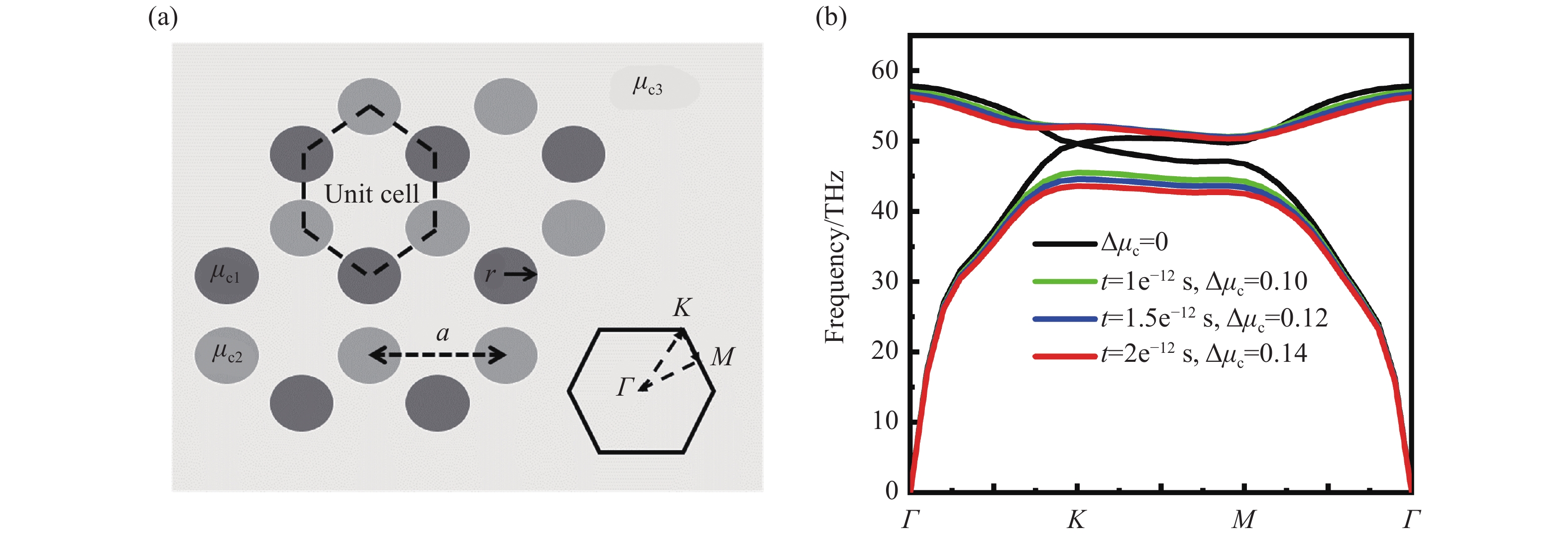 Figure 5. (a) Schematic diagram of the Zigzag interface based on graphene plasmon time crystals, in which the bottom is the calculation model of the finite period super cell unit and the simulation electric field distribution results. (b) The dispersion curves of the Zigzag interface mode at different times