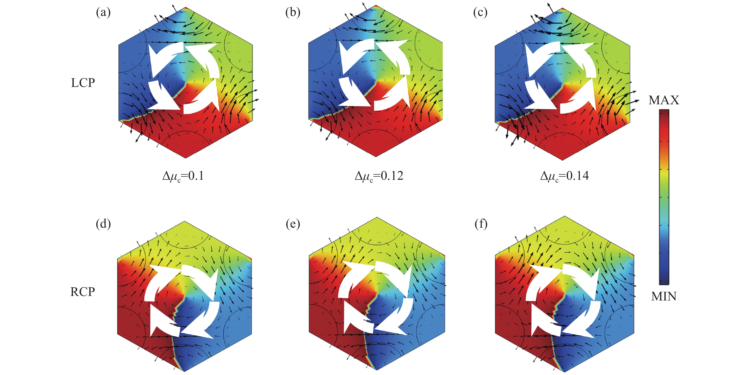 $ \Delta {\mu _{\rm{c}}} $ =0.1 eV时刻,K点的相位分布图;(b)和(e)是在$ \Delta {\mu _{\rm{c}}} $ =0.12 eV时刻,K点的相位分布图;(c)和(f)在$ \Delta {\mu _{\rm{c}}} $ =0.14 eV时刻,K点的相位分布图Figure 4. The phase distributions of Left-handed Circularly Polarized (LCP) and Right-handed Circularly Polarized (RCP) of the time crystal appear at point K, which are expressed as the component of the electric field in the direction Z and the in-plane Poynting vector (Px, Py). (a) and (d) the phase distribution diagram of point K at the time of