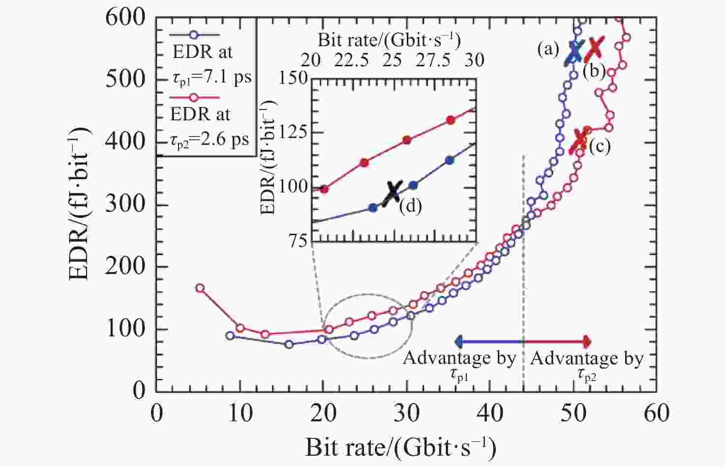 图 4 较长光子寿命(蓝线)和较短光子寿命(红线)的高速VCSEL的大信号调制的比特率BR和能耗EDR关系。通过实验计算的频谱效率约为M=2.1[20]
