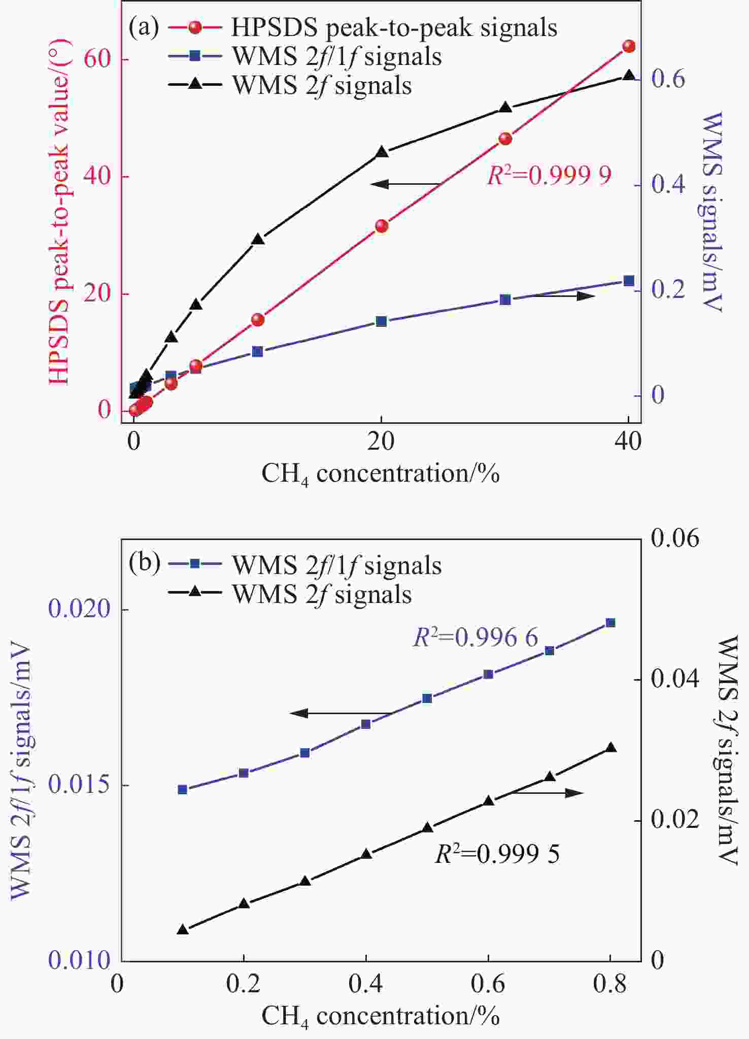 Figure 5.  (a) Measured dispersion phase signals at different CH4 concentrations; (b) peak-to-peak values of HPSDS signals as a function of CH4 concentration