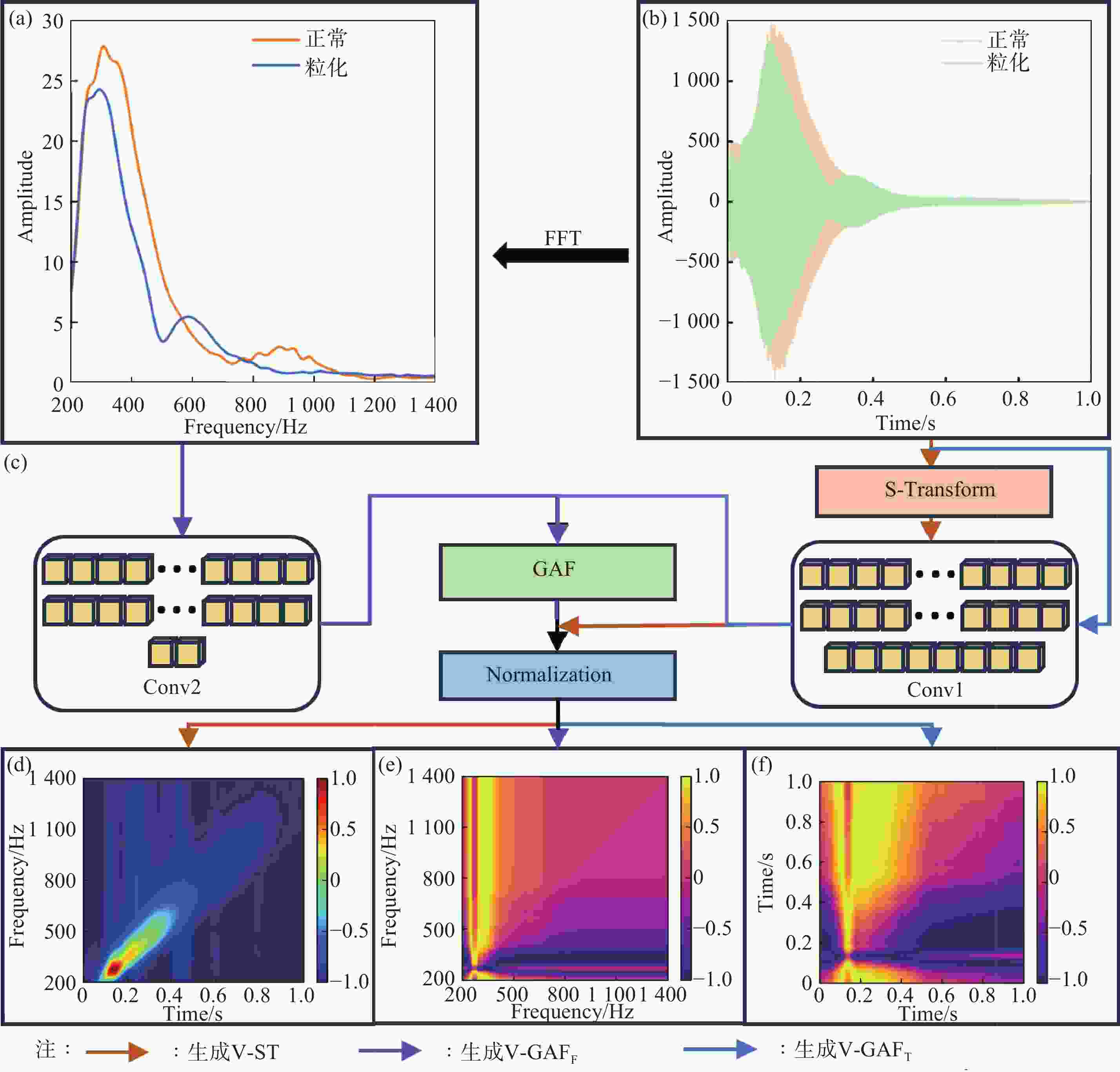 图 3 振动多域图像生成流程图。(a)经过快速傅立叶变换得到的果冻橙振动频谱曲线;(b)果冻橙振动响应信号;(c)振动多域图像生成模块,其包含对时频信号降维的卷积块、生成时频图像的Stockwell transform(ST)块、将时频域信号生成时域或频域图像的格拉姆角场(GAF)块以及归一化块;(d)振动ST时频域图像可视化结果,(e)振动GAF频域图像可视化结果;(f)振动GAF时域图像可视化结果