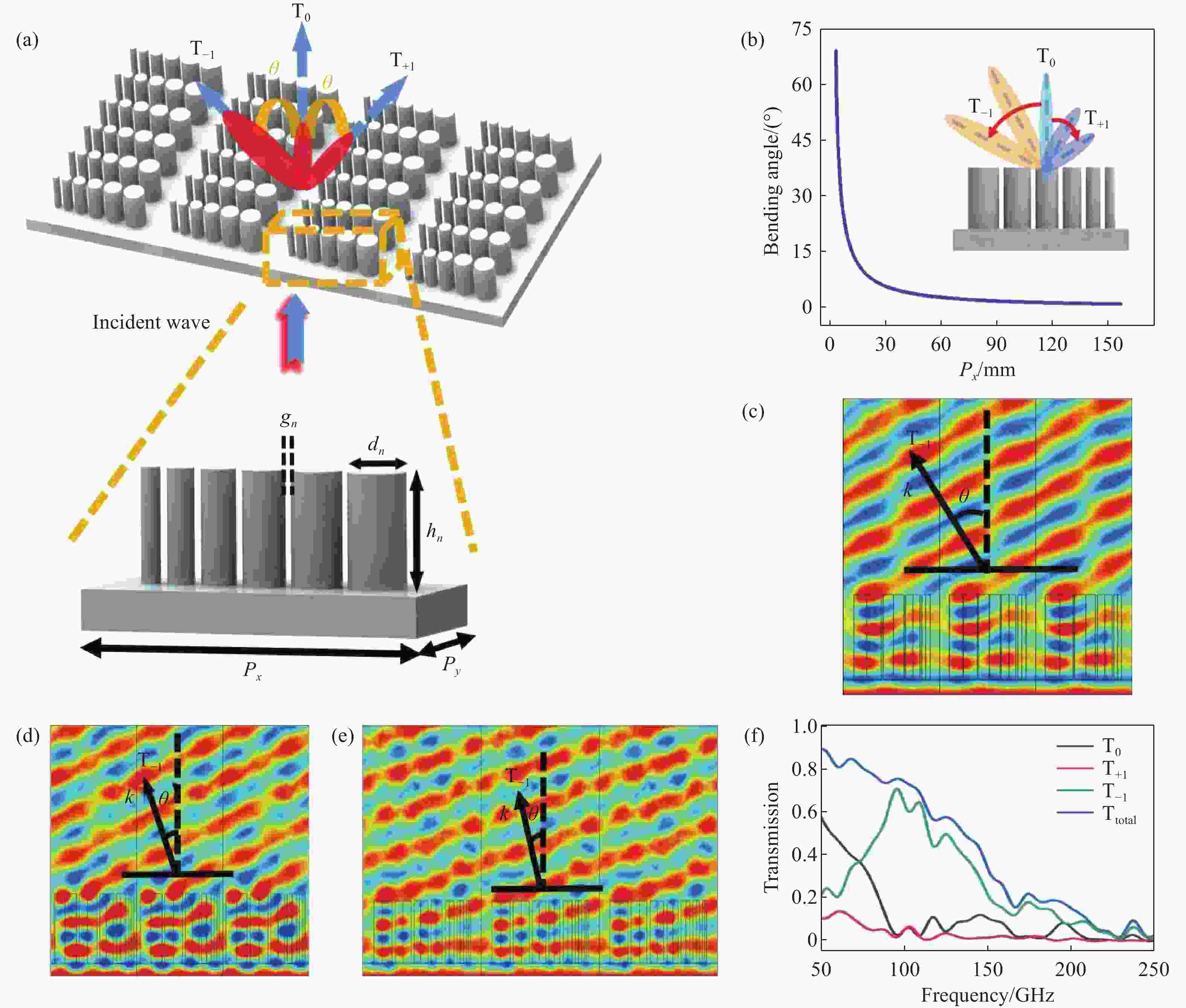 图 1 超构光栅的原理和特性。(a) 基于非对称单元结构的超构光栅阵列结构示意图;(b) 不同衍射周期T−1阶的偏折角度;(c-e) 微波入射超构光栅阵列时,偏折角度分别为32.01°、22.05°和12.13°的模拟电场分布;(f) 不同衍射阶的透射光谱(T0、T−1、T+1、Ttotal分别表示衍射阶0、−1、+1和total的透射率)