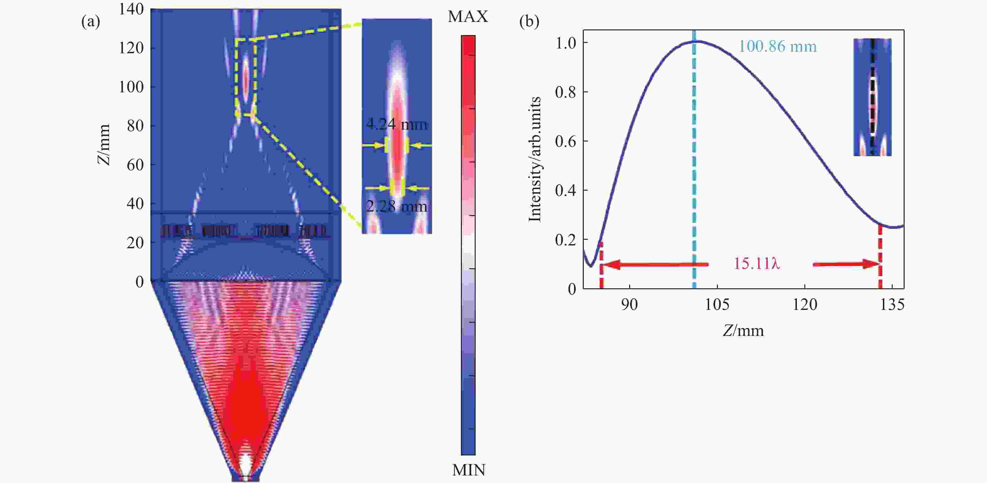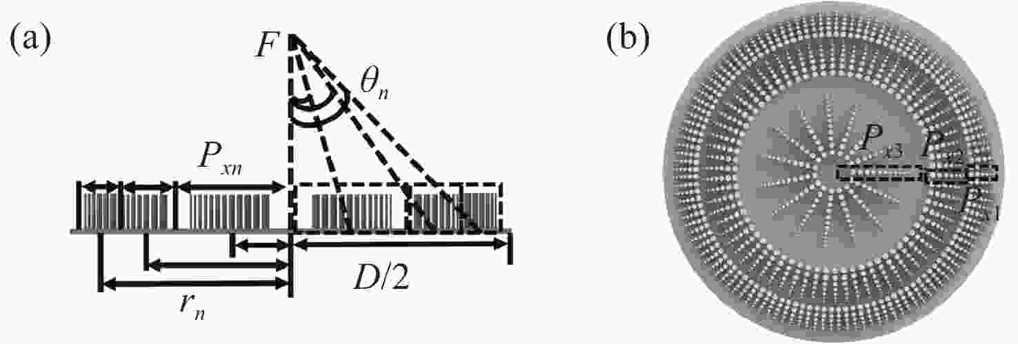 λ ,焦深约为15.11λ 。本文设计的超构天线兼具长焦深与高效率特性,其亚波长聚焦特性显著提升了空间分辨率,为微波成像及无损检测等领域的高精度传感检测提供了新的解决方案,具有潜在的应用价值。Abstract:Limited by the diffraction limit, the spatial resolution of traditional microwave antennas is difficult to break through the constraint of the wavelength scale, which hinders their application in high-resolution microwave sensing and detection. In this paper, we design an all-dielectric integrated meta-antenna beyond the physical diffraction limit. Firstly, the meta-antenna is functionalized using asymmetric scattering metagrating array based on the generalized Snell's law. High-efficiency focusing beam in the sub-wavelength scale is obtained by manipulating the electromagnetic wavefront. Then, by optimizing the geometric structure of the metagrating to achieve high manipulation efficiency. Finally, the electric field intensity distribution of the generated focal spot is analyzed. The simulation results demonstrate that the manipulation and diffraction efficiencies of the metalens reach 98.50% and 72.56%. The metalens shows a focal spot with the diameter of 0.73λ and depth of focus (DOF) of 15.11λ. The designed meta-antennas possess the characteristics of long focal depth and high efficiency. Its sub-wavelength focusing property significantly enhances the spatial resolution, which provides a new method for high-precision sensing and detection in the fields such as microwave imaging and non-destructive testing, possessing potential application value.