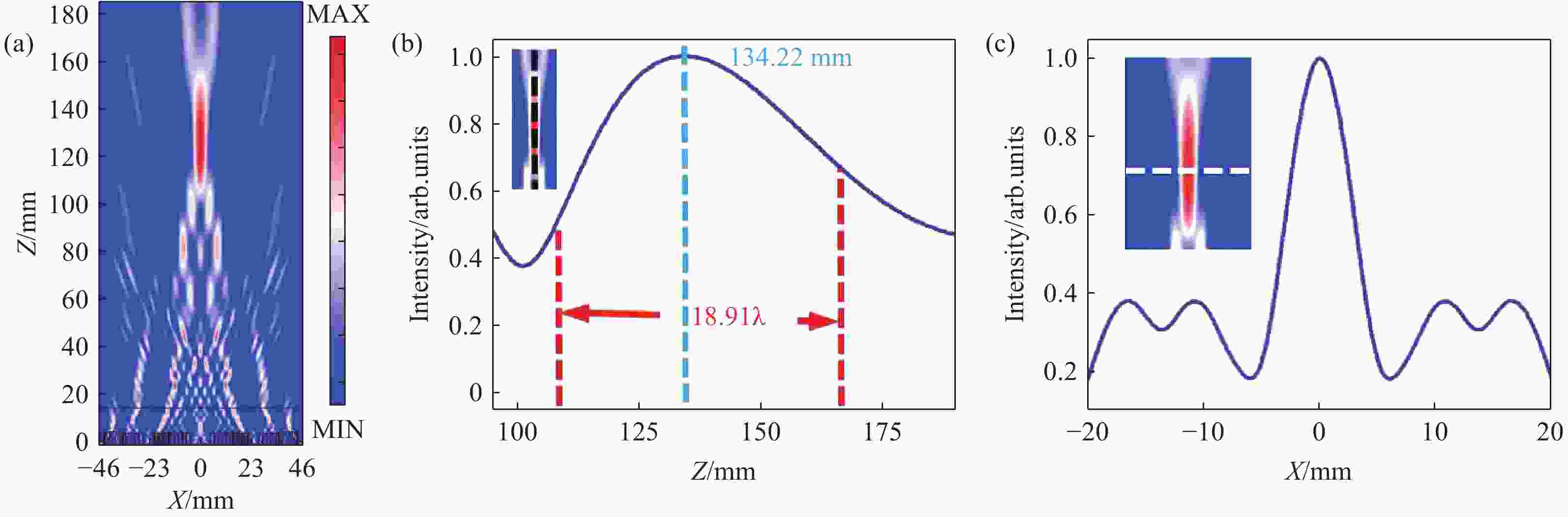图 4 (a) 超构透镜的电场强度分布;(b) 沿z轴方向的归一化强度分布图;(c) 在焦平面上沿x轴方向的归一化强度分布图