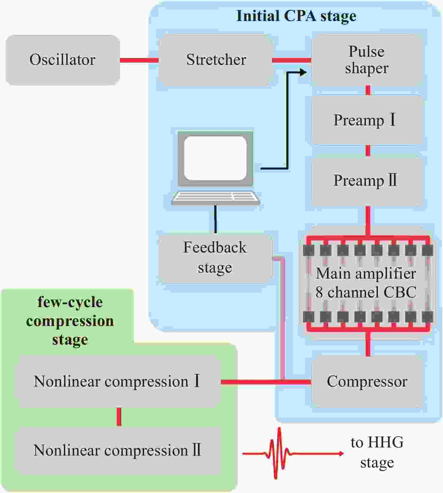 Abstract:In recent years, ultrafast fiber laser coherent beam combination (CBC) has developed rapidly, becoming an important technical means for enhancing the average power of ultrafast and ultra-intense lasers. However, due to factors such as spectral gain narrowing in single-channel fiber amplifiers and high-order dispersion mismatch, the output pulse width of high-power ultrafast fiber laser CBC systems is significantly wider compared to that of bulk solid-state laser systems, severely limiting its peak power enhancement. From the perspective of pulse compression in ultrafast fiber laser coherent combining, this review systematically analyzes the following three aspects: pulse shaping technique based on fiber chirped pulse amplification, combining technique based on fiber nonlinear spectral broadening, and coherent spectral combining technique based on partial spectral interference. Additionally, a brief conclusion and outlook on the future development of ultra-short pulse fiber laser CBC is given at the end.