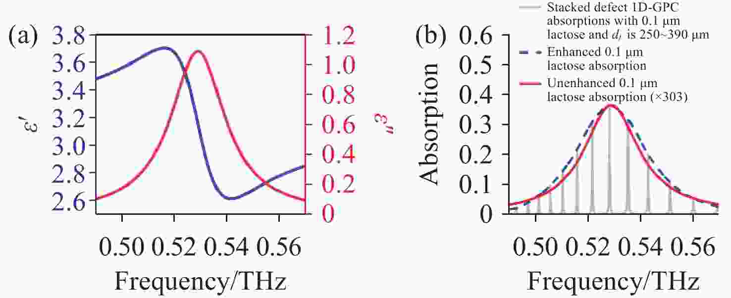 图 3 (a)α-乳糖在0.49 ~ 0.57 THz频带内对应介电常数的实部和虚部。(b)1D-PCs堆叠结构涂敷0.1 µm α-乳糖的增强吸收光谱和无支撑α-乳糖薄膜放大303倍的吸收谱