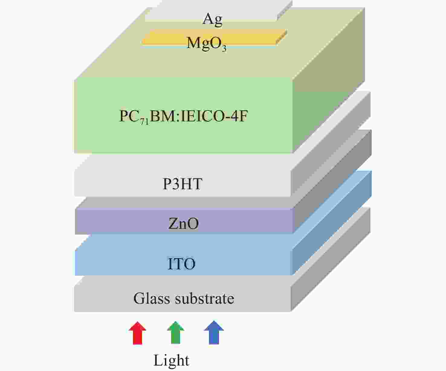 Abstract:This study investigates the impact of doping the non-fullerene small molecule IEICO-4F into the acceptor component of a planar heterojunction organic photodetector based on the P3HT : PC71BM system on the device's optoelectronic properties. The active layer films with different doping ratios were fabricated using a solution process. Characterization techniques including current-voltage measurements, external quantum efficiency, ultraviolet-visible-near-infrared absorption spectroscopy, and photoluminescence spectroscopy were employed, combined with atomic force microscopy to analyze morphological evolution. Experimental results demonstrate that the introduction of IEICO-4F significantly broadens the absorption spectrum of the active layer into the near-infrared region (700−900 nm) and enhances photon capture efficiency through complementary absorption spectrum. At an optimized doping ratio of 30%, the device's photocurrent density increases from 19.17 mA/cm2 to 27.25 mA/cm2, and the specific detectivity improves from 0.78×1012 Jones to 1.45×1012 Jones. Morphological analysis confirms that IEICO-4F optimizes the phase distribution of PC71BM, forming a finer interpenetrating network structure that facilitates charge transfer and reduces series resistance. The study also reveals that excessive doping disrupts the phase separation balance, adversely affecting carrier separation and transport, leading to an imbalance in electron-hole transport. This work highlights the multifaceted regulatory effect of non-fullerene acceptor doping on traditional polymer: fullerene systems, effectively enhancing device performance through the synergistic mechanisms of spectral broadening and morphological optimization, thereby providing new insights for the design of organic photodetector material systems.