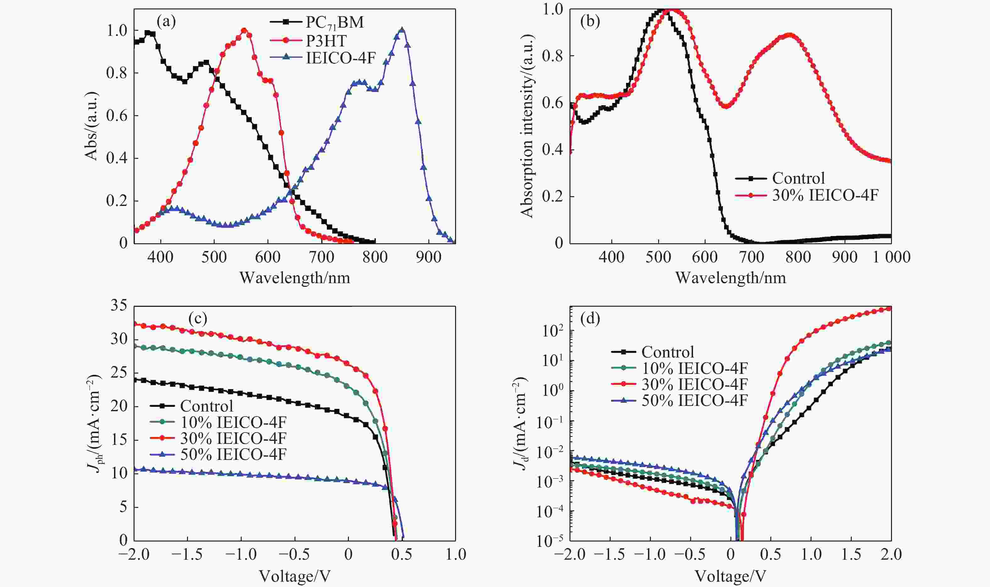 图 2 (a) 活性层三种材料的归一化吸收;(b) 器件活性层的归一化吸收;(c) 在光照条件下,不同IEICO-4F掺杂浓度的器件所呈现的电流密度-电压响应特性;(d) 在暗条件下,不同IEICO-4F掺杂浓度的器件所呈现的电流密度-电压响应特性