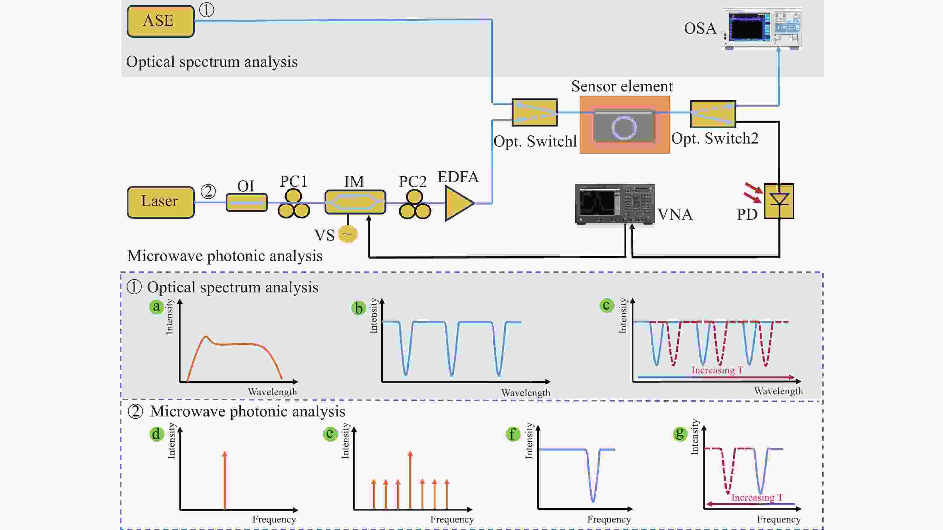 图 3 温度传感系统示意图及工作原理。(ASE:放大自发辐射;OI:光隔离器;PC:偏振控制器;IM:强度调制器;VS:电压源;EDFA:掺铒光纤放大器;Opt. Switch:光开关;PD:光电探测器;VNA:矢量网络分析仪;OSA:光谱分析仪)