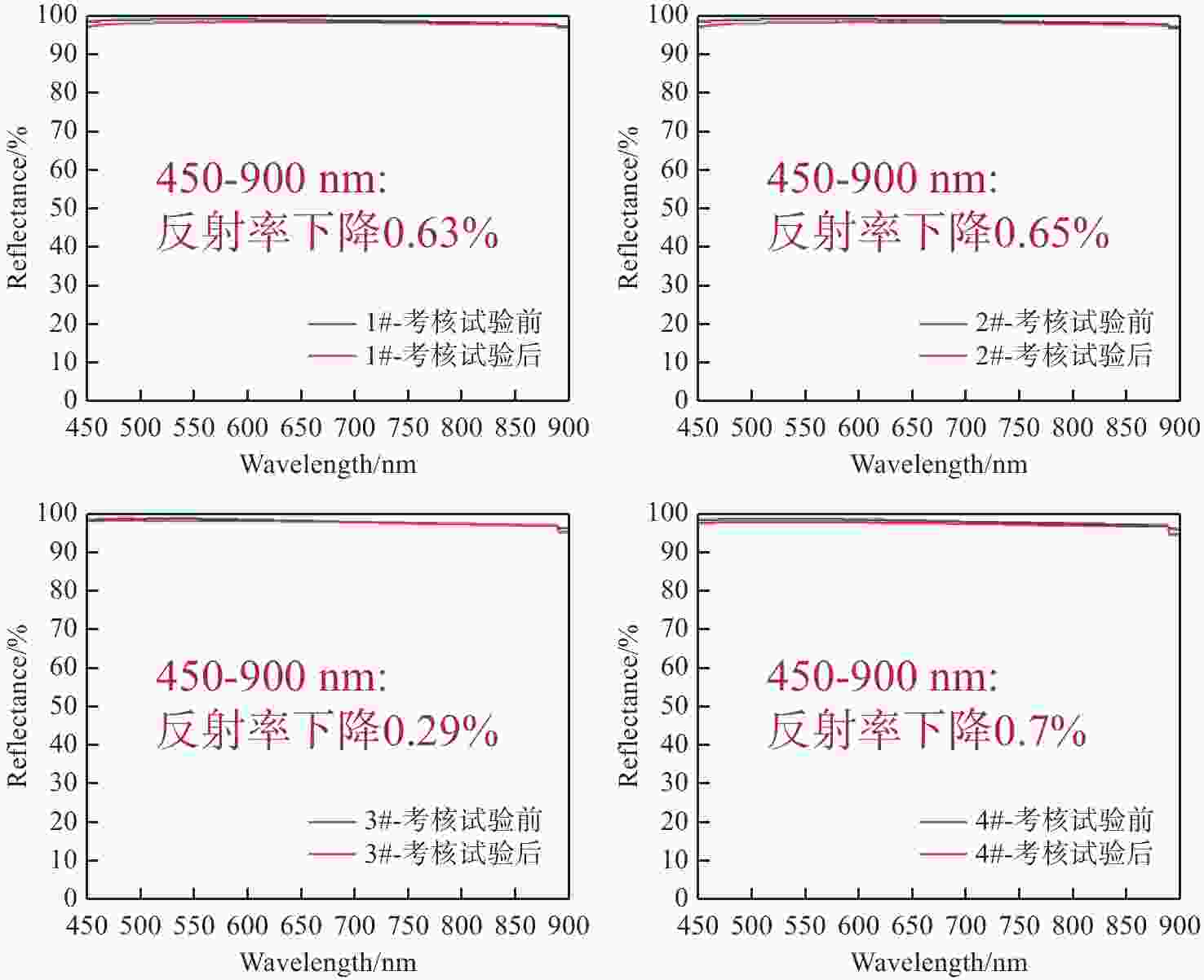 (样品编号:5#、6#、7#、8#)ΔR̄ 脱膜情况 ΔR̄ 脱膜情况 高低温循环实验 0.11% 否 0.08% 否 振动实验 0.08% 否 0.04% 否 恒定高温试验 0.11% 否 0.10% 否 温湿度试验 0.12% 否 0.12% 否 -