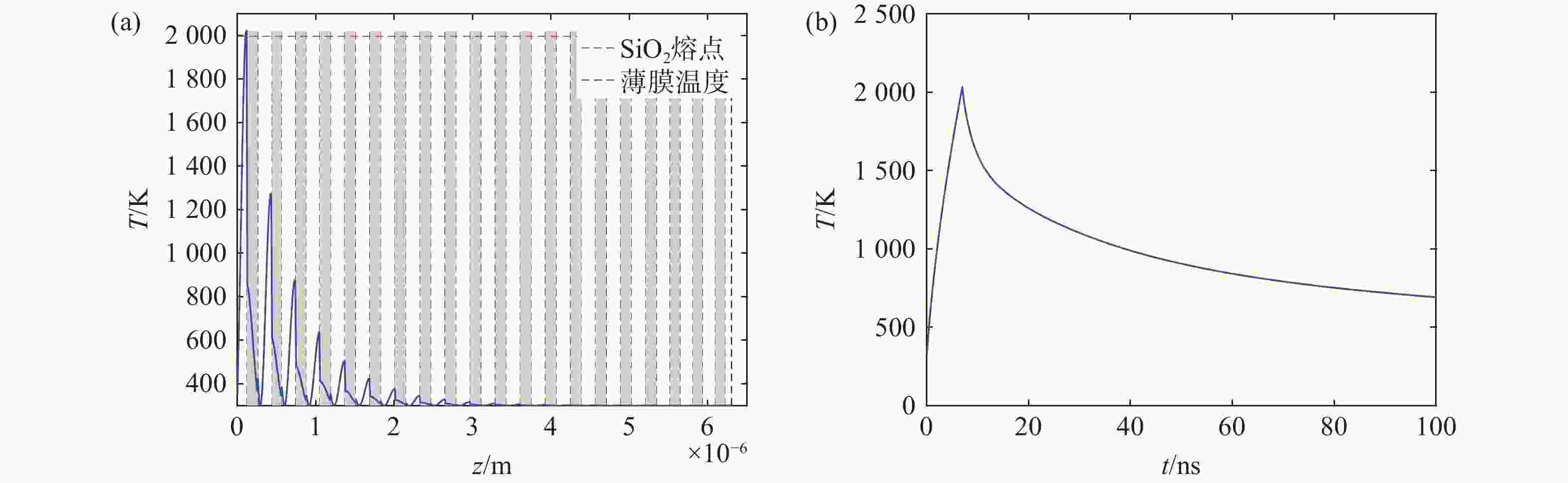 方法以 HfO2/SiO2多层介质薄膜结构为例,基于金宝搏188软件怎么用 诱导电离/电子倍增过程,在光场计算中引入Drude模型,将膜层折射率由静态常数扩展为由自由电子密度驱动的动态复折射率。在此基础上耦合热传导(及热应力)模型,计算纳秒脉冲金宝搏188软件怎么用 作用下薄膜内部的热效应演化,并求得相应的损伤阈值为13.65 J/cm2,同时开展实验研究其损伤特性。