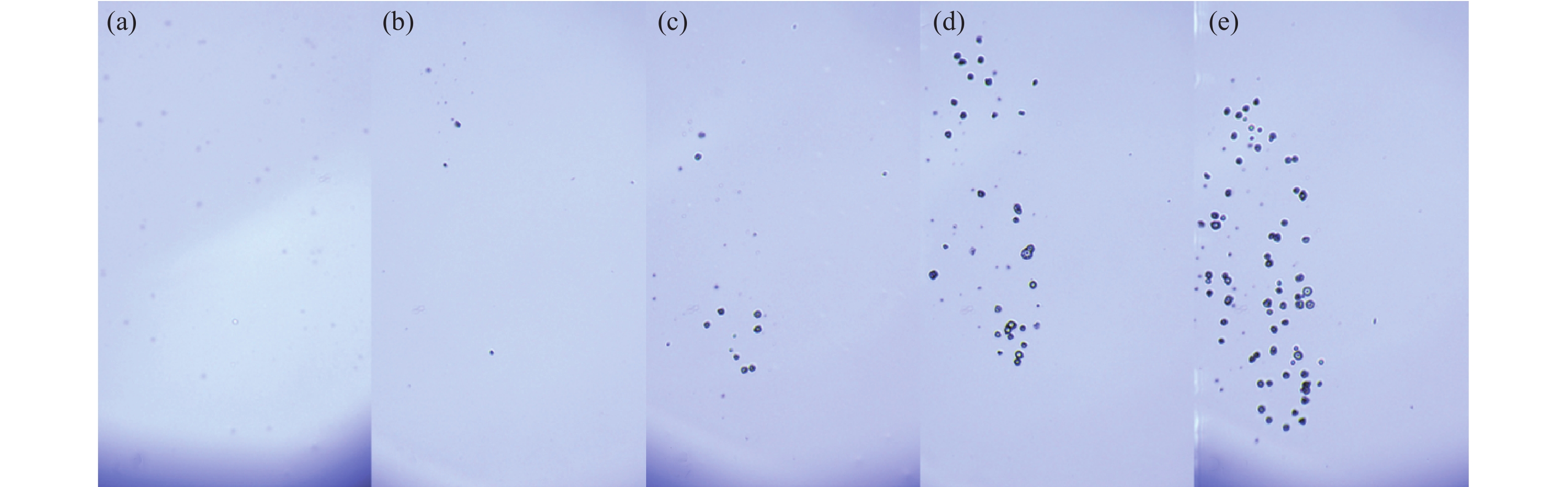 Figure 9. Damage morphology within the film after irradiation with different laser energies (a) Laser energy density 12.5 J/cm2; (b) Laser energy density 14.5 J/cm2; (c) Laser energy density 20.0 J/cm2; (d) Laser energy density 5.0 J/cm2; (e) Laser energy density 30.0 J/cm2