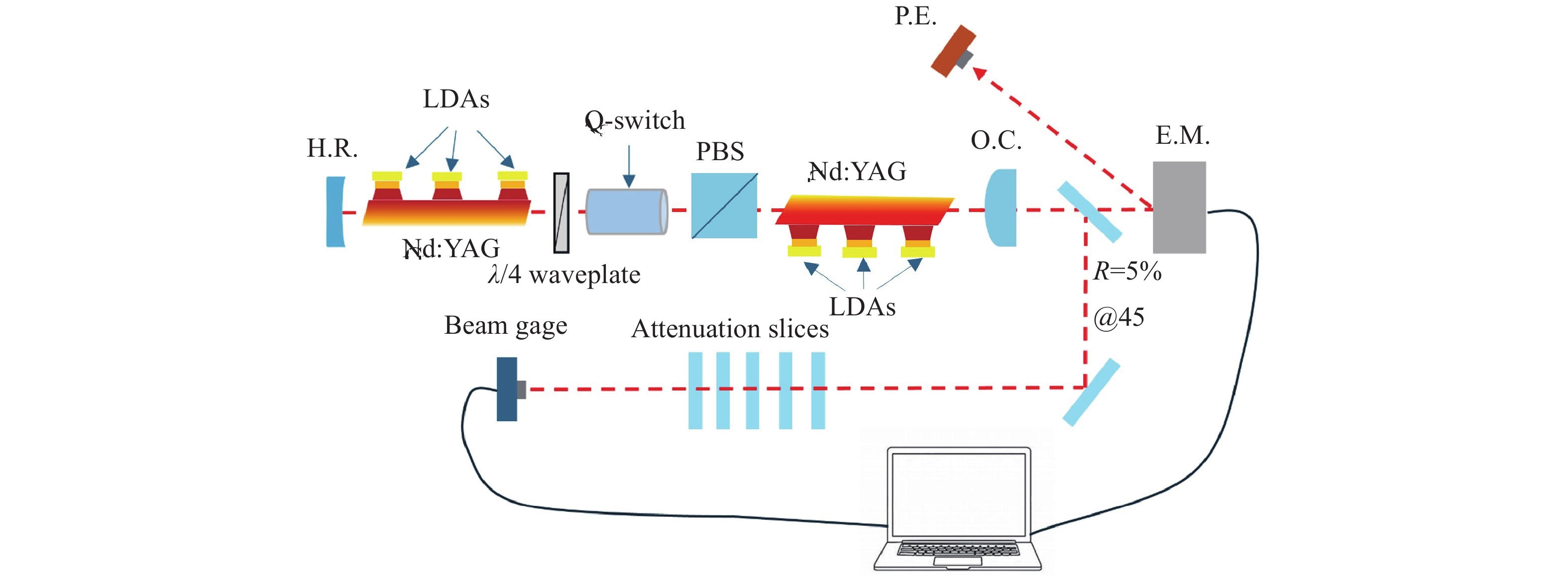 Abstract:To achieve simultaneous lightweight design and high-energy output under special environmental conditions, a compact, water-cooling-free high-energy pulsed laser system based on high-temperature laser diode array (LDAs) side-pumped zigzag Nd:YAG crystals is demonstrated for operation in demanding environments. The zigzag beam propagation increases the effective gain length, while symmetric LDAs pumping of two Nd:YAG crystals improves gain uniformity. Thermal isolation between the crystals and LDAs is implemented, with independent temperature control achieved using thermoelectric coolers (TEC) for the Nd:YAG crystals and forced air cooling for the LDAs. A potassium dideuterium phosphate (DKDP) crystal is employed for electro-optic Q-switching. At a repetition rate of 100 Hz without water cooling, a maximum pulse energy of 129.2 mJ with a pulse duration of 9.0 ns is obtained, corresponding to an optical-to-optical efficiency of 9.6% and a slope efficiency of 13.1%, with energy stability better than 2.26%. An output energy of 87.6 mJ is achieved at 150 Hz. This system provides a compact and environmentally robust light source for laser ranging and illumination applications.