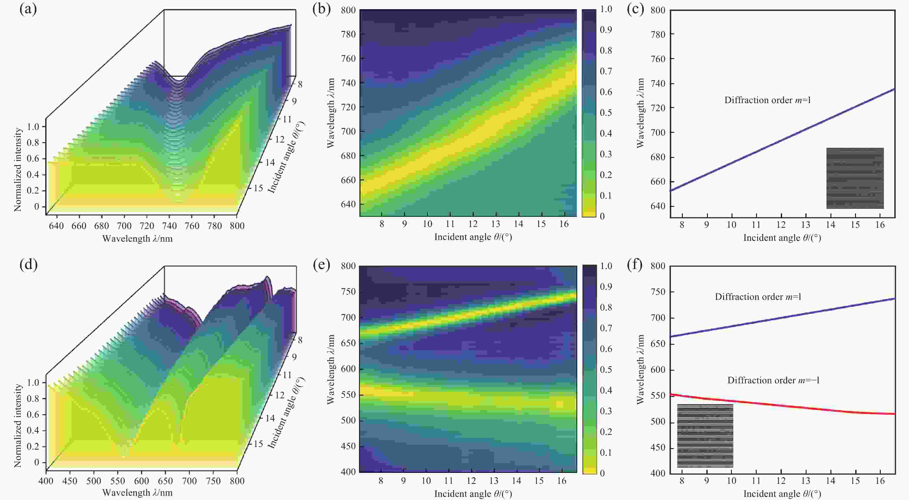 Figure 9. (a) Angle-resolved spectra of one-dimension grating on silver; (b) angle-resolved intensity of one-dimension grating on silver; (c) theoretical numerical simulation results of one-dimension grating on silver; (d) angle-resolved spectra of one-dimension grating on gold; (e) angle-resolved intensity of one-dimension grating on gold; (f) theoretical numerical simulation results of one-dimension grating on gold