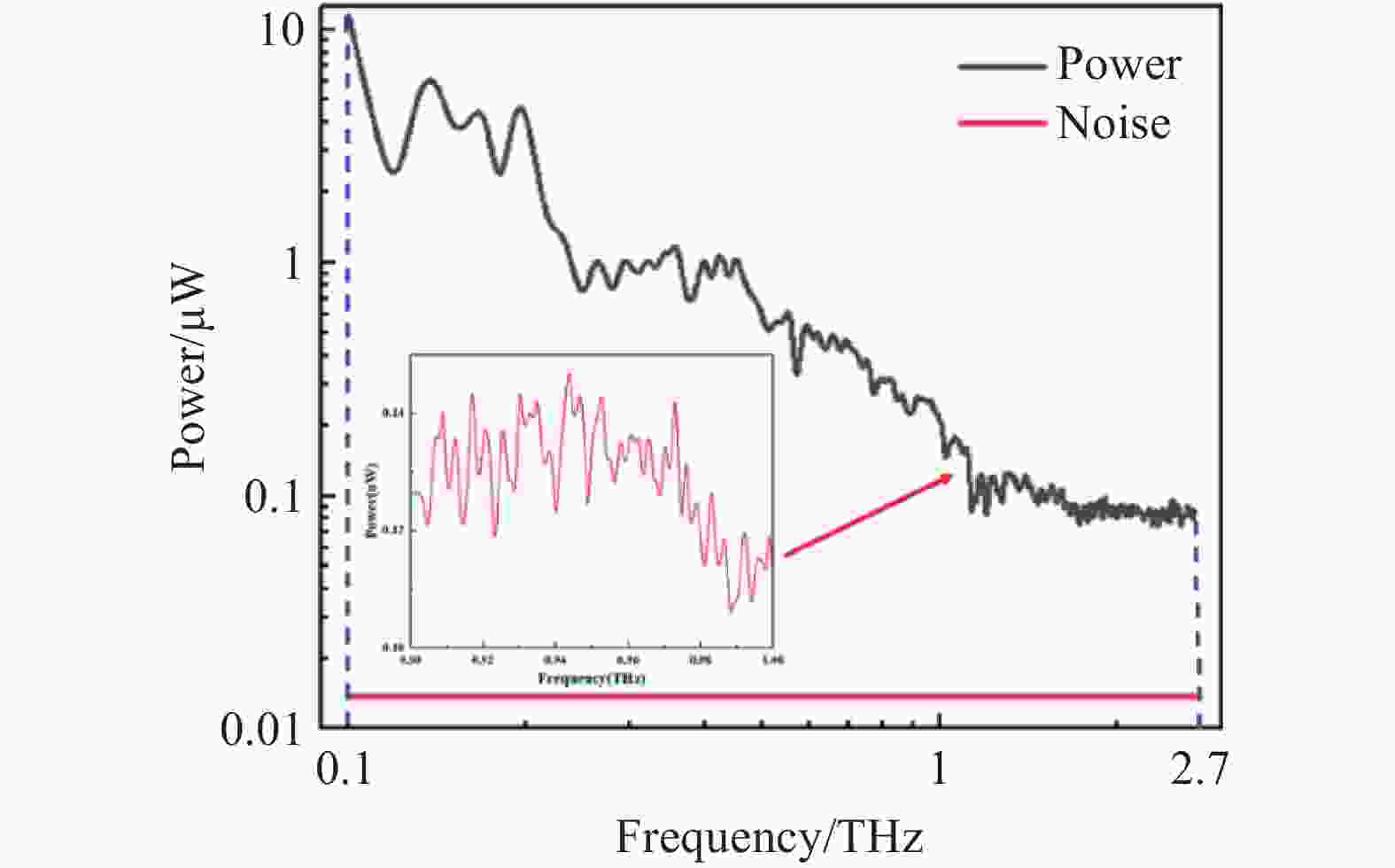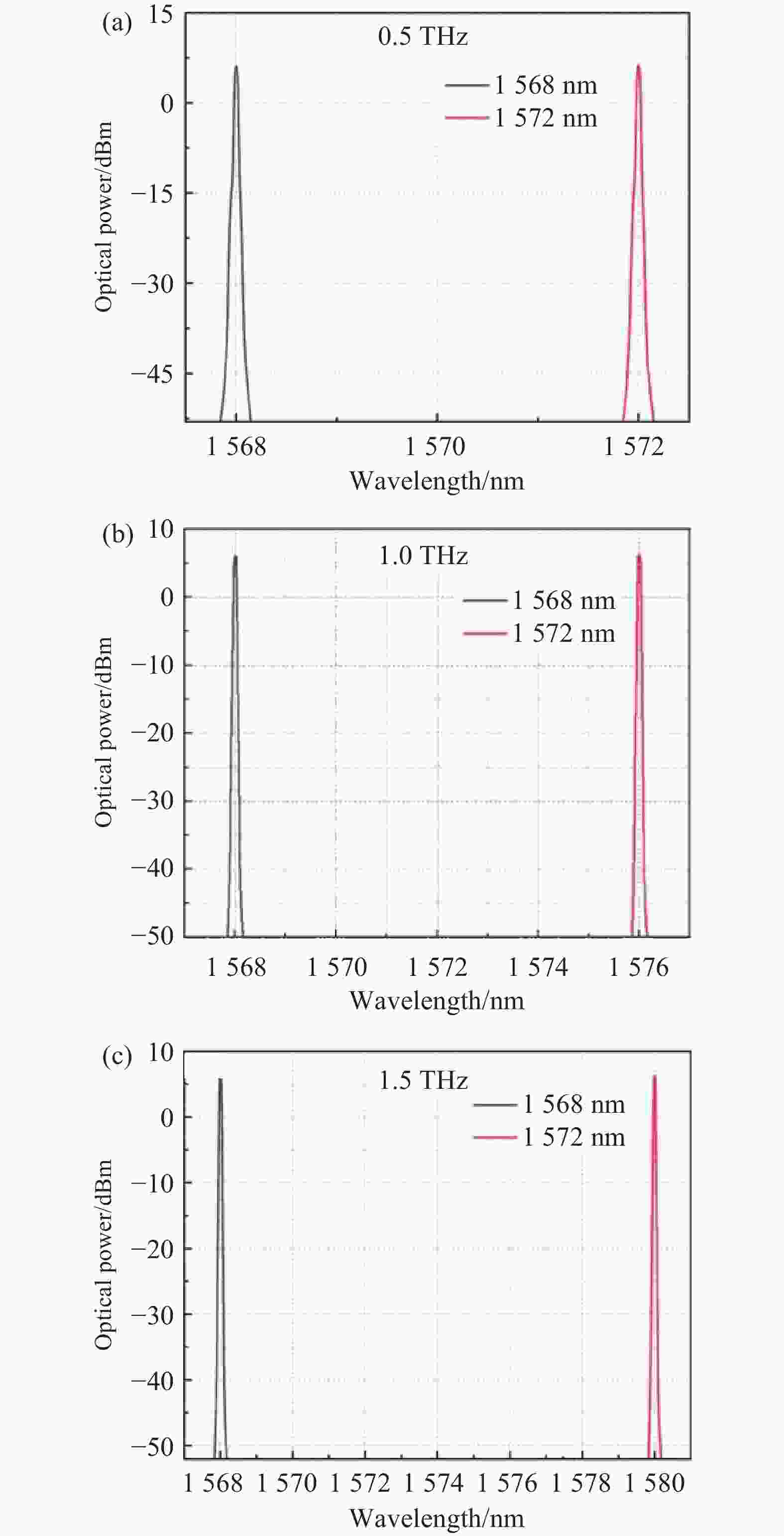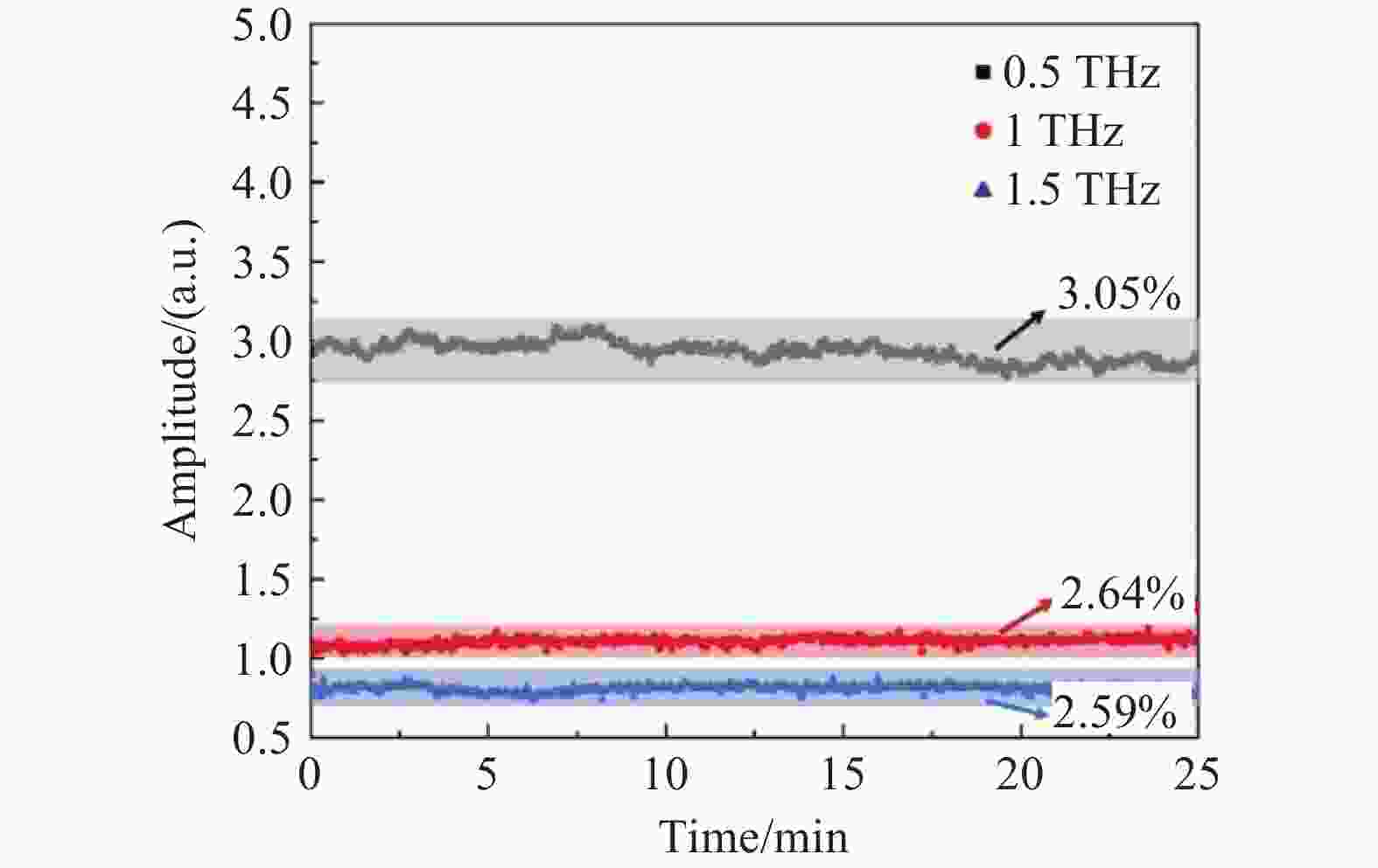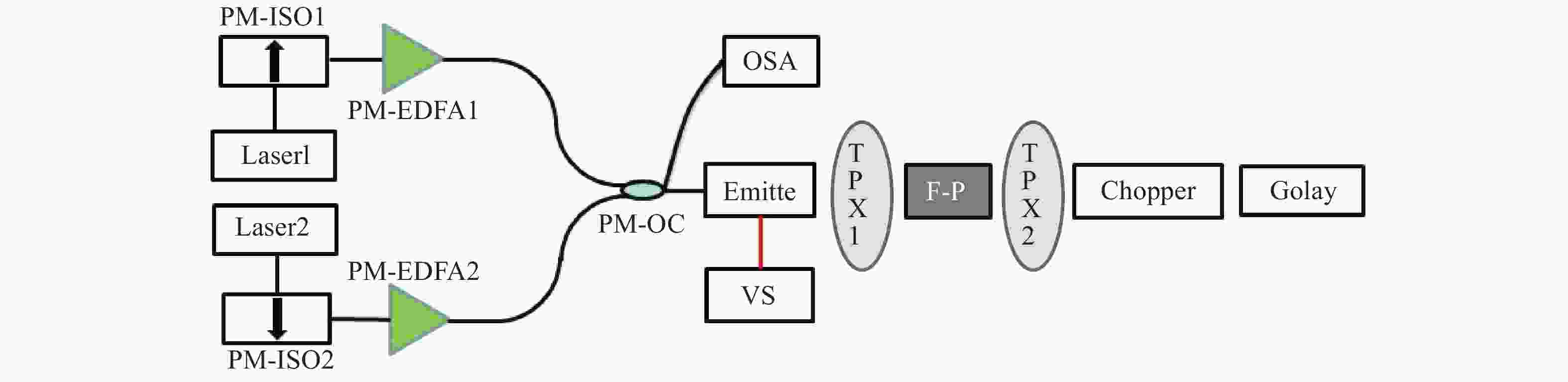 1568.8 ~1589.6 nm波长范围内产生0.1~2.7 THz连续太赫兹辐射。并使用高莱盒探测器和太赫兹扫描法布里-珀罗干涉仪对太赫兹波分别进行功率及频率测试。结果表明,太赫兹波在25分钟内的功率不稳定度在4%以内, 0.5 THz、1 THz处的频率测量结果与L波段双金宝搏188软件怎么用 的间隔频率高度一致。此外,在0.9~1 THz范围内,实现了1 GHz的高精度调谐,对应0.008 nm的波长间隔。该连续精调谐太赫兹辐射源在高精度光谱检测等领域具有较高的应用潜力。Abstract:This paper presents a continuously fine-tunable terahertz radiation source based on L-band laser difference frequency generation, with a frequency tuning range of 0.1 to 2.7 THz and a tuning accuracy of 1 GHz. A fully polarization-maintaining fiber link, including polarization-maintaining isolators, polarization-maintaining couplers, and polarization-maintaining erbium-doped fiber amplifiers, was designed to keep the polarization states of the two beams consistent. By using the difference frequency of L-band dual lasers to excite the InGaAs high-performance photoconductive antenna, continuous terahertz radiation ranging from 0.1 to 2.7 THz was generated within the wavelength range of