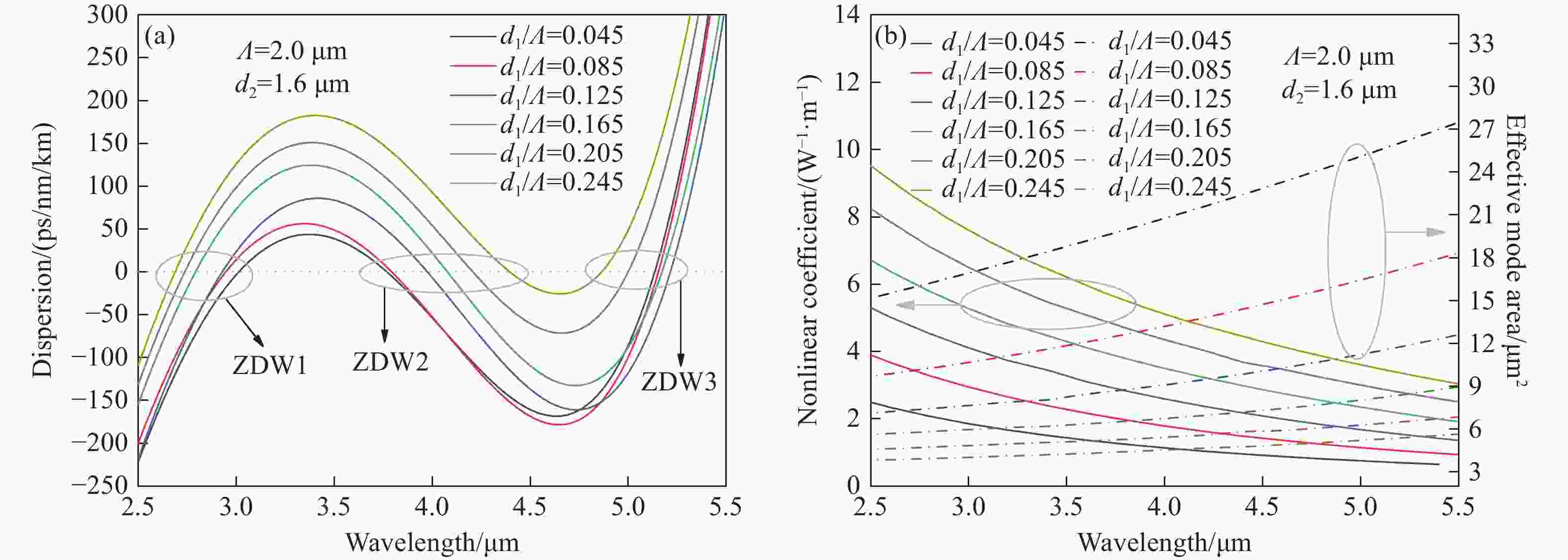 d 1/Λ of 0.125,d 2/Λ of 0.583 and the zero-dispersion wavelength of 3.228 μm by pumping with a Gaussian pulse with a peak power of 800 W and a full width at half maximum (FWHM) of 20 fs at wavelength of 3.3 μm. When the fiber is pumped by the pulse with the peak power of2000 W, the FWHM of 80 fs at the wavelength of 4.0 μm in the in the anomalous dispersion region, the modulation instability is obviously suppressed, and the high-coherence supercontinuum spectrum spanning from 1.1 μm to 8.99 μm is observed. A part of the pulse energy is transferred to the anomalous dispersion region when pumped at the wavelength of 2.8 μm in the normal dispersion region and a broadband high-coherence supercontinuum spectrum extending from 0.8 μm to 9.8 μm is generated in the 10 mm proposed fiber. This paper introduces elliptical air holes in the Al0.24Ga0.76As photonic crystal fiber, which enhances flexibility for tailoring the performance of supercontinuum, ultimately achieving the broadest supercontinuum spectrum with the shortest fiber length to date.-