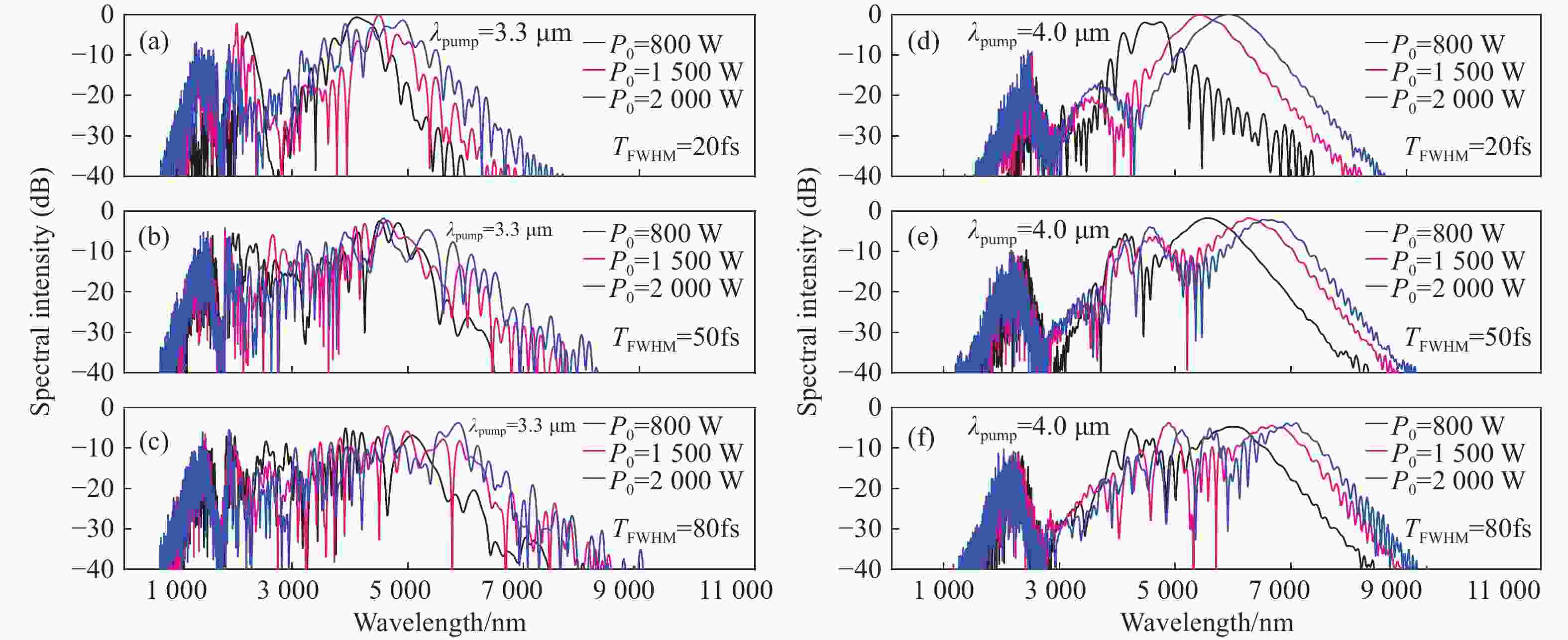 λpump=3.3 μm TFWHM=20 fs TFWHM=50 fs TFWHM=80 fs P0=800 W N=6.50 N=16.20 N=25.86 Lfiss=1.65 mm Lfiss=4.12 mm Lfiss=6.60 mm LMI=4.08 mm LMI=4.08 mm LMI=4.08 mm P0= 1500 WN=8.85 N=22.00 N=35.40 Lfiss=1.20 mm Lfiss=3.00 mm Lfiss=4.80 mm LMI=2.18 mm LMI=2.18 mm LMI=2.18 mm P0= 2000 WN=10.20 N=25.56 N=40.90 Lfiss=1.04 mm Lfiss=2.61 mm Lfiss=4.2 mm LMI=1.60 mm LMI=1.60 mm LMI=1.60 mm Table 2. Soliton order and characteristic lengths for different pulses at a pump wavelength of 4.0 μm