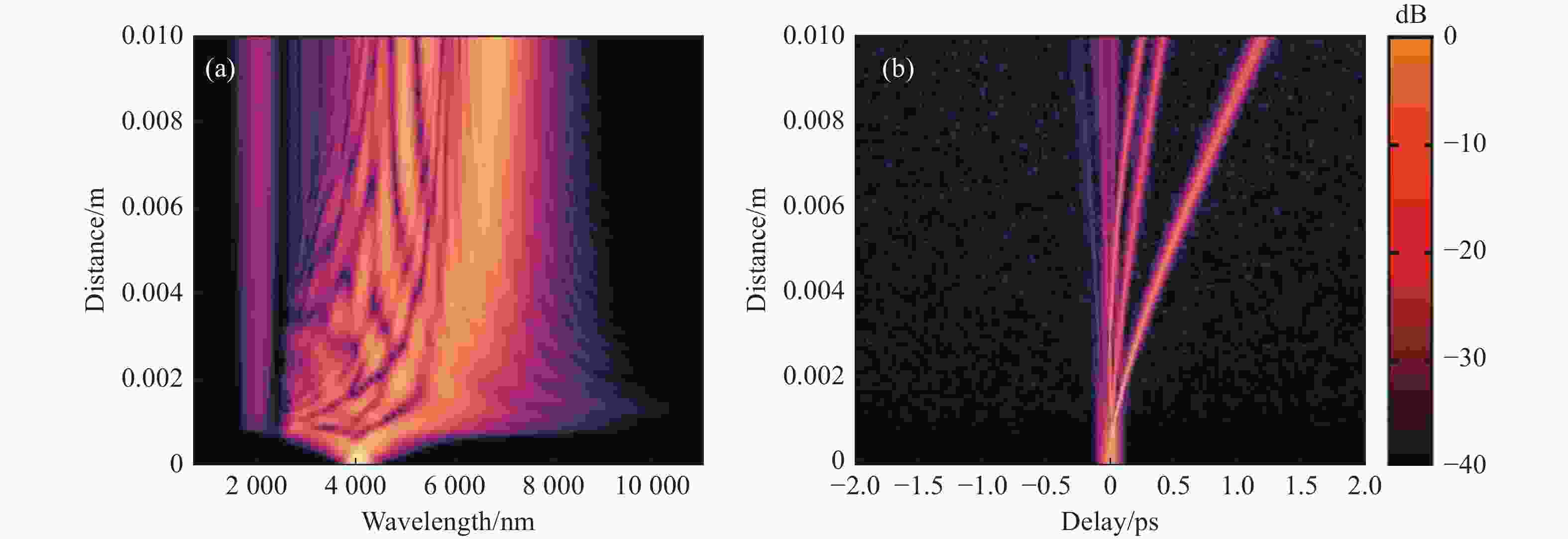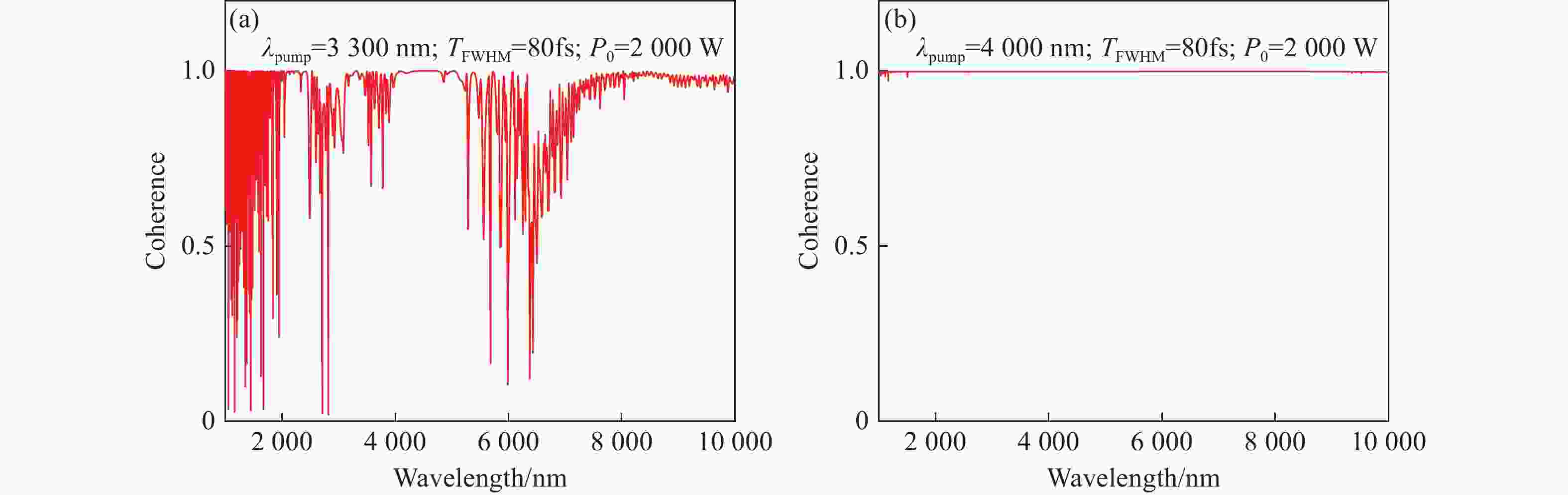 d 1/Λ 为0.125、d 2/Λ 为0.583并且零色散波长为3.228 μm时,通过在3.3 μm处以峰值功率800 W、半高全宽20 fs的高斯脉冲泵浦10 mm光纤,可获得谱宽为4.852 μm的超连续谱。在反常色散区泵浦脉冲波长为4.0 μm、峰值功率为2000 W、半高全宽为80 fs时,调制不稳定性效应被明显抑制,可获得从1.1 μm扩展到8.99 μm的宽带高相干性超连续谱。在正常色散区2.8 μm处泵浦该光纤,可使部分脉冲能量转移到反常色散区,可在10 mm光纤输出端得到从0.8 μm扩展到9.8 μm的宽带高相干性超连续谱。本文在Al0.24Ga0.76As光子晶体光纤中引入了椭圆气孔,为调整超连续谱的性能增加了灵活度,用最短的光纤获得了最宽的超连续谱。-