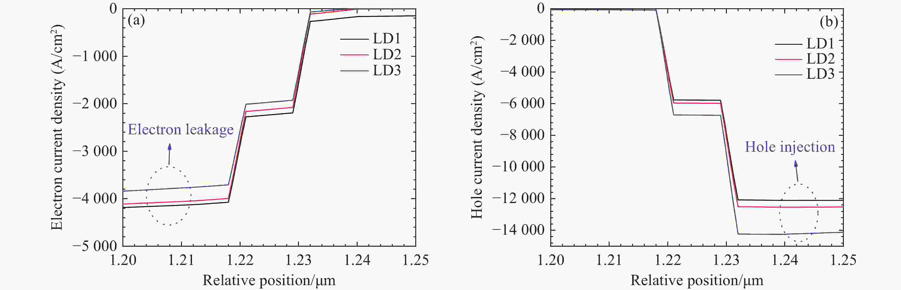 Abstract:AlGaN-based deep-ultraviolet (DUV) laser diodes (LDs) face performance challenges due to electron leakage and poor hole injection which is often worsened by polarization effects from conventional electron blocking layers (EBLs). To overcome these limitations, we propose an EBL-free DUV LD design incorporating a 1-nm undoped Al0.8Ga0.2N thin strip layer after the last quantum barrier. Using PICS3D simulations, we evaluate the optical and electrical characteristics. Results show a significant increase in effective electron barrier height (from 158.2 meV to 420.7 meV) and a reduction in hole barrier height (from 149.2 meV to 62.8 meV), which enhance hole injection and reduce electron leakage. The optimized structure (LD3) achieves a 14% increase in output power, improved slope efficiency (1.85 W/A), and lower threshold current. This design also reduces the quantum confined Stark effect and forms dual hole accumulation regions, improving recombination efficiency.