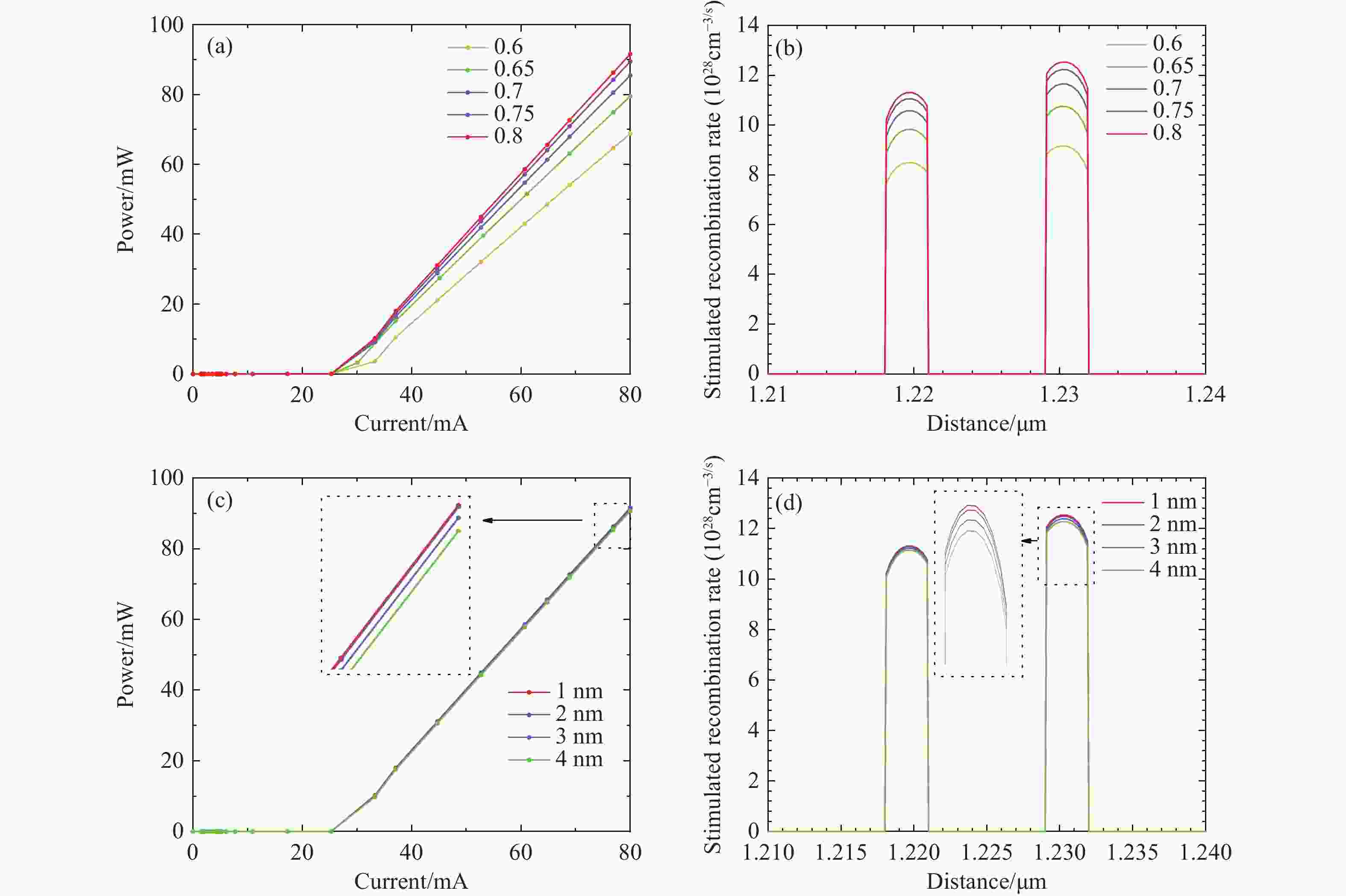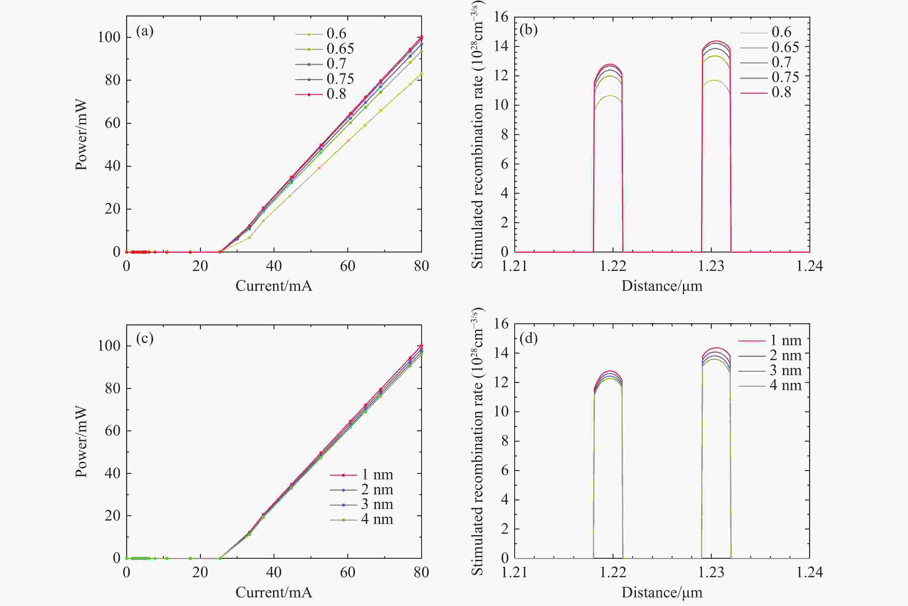 Figure 8. (a) LD3 output power varying with different Al components, (b) LD3 recombination rates varying with different Al components in MQWs, (c) output power varying with different thickness of Al0.8Ga0.2N strip of LD3, and (d) recombination rates varying with different thickness of Al0.8Ga0.2N strip of LD3 in MQWs