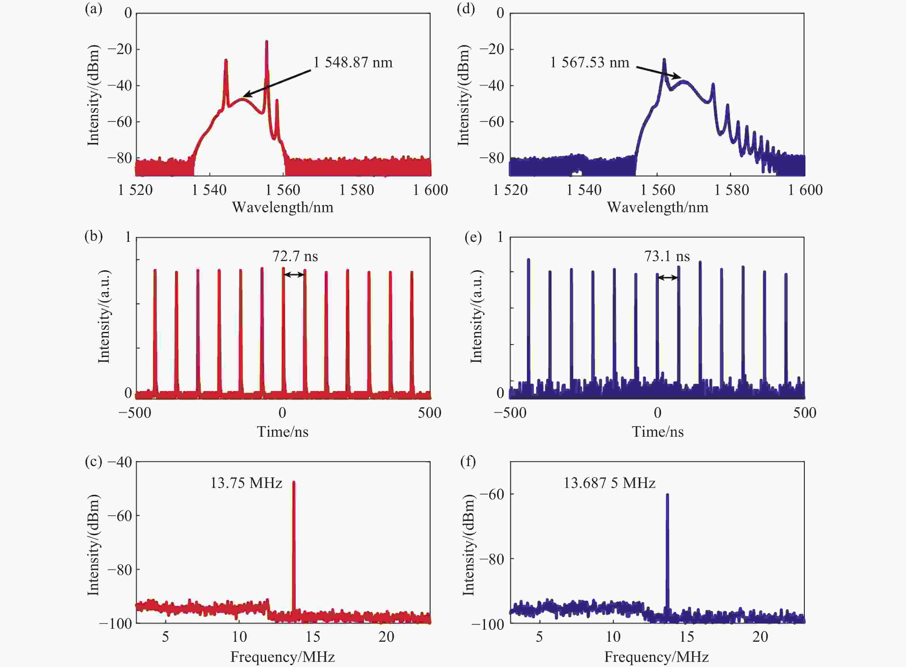 Figure 2. Outputs of sub-cavity 1 and sub-cavity 2. Sub-cavity 1: (a) optical spectrum; (b) pulse sequence measured by oscilloscope; (c) radio frequency (rf) spectrum with a span of 20 MHz. Sub-cavity 2: (d) optical spectrum; (e) pulse sequence measured by oscilloscope; (f) RF spectrum with a span of 20 MHz