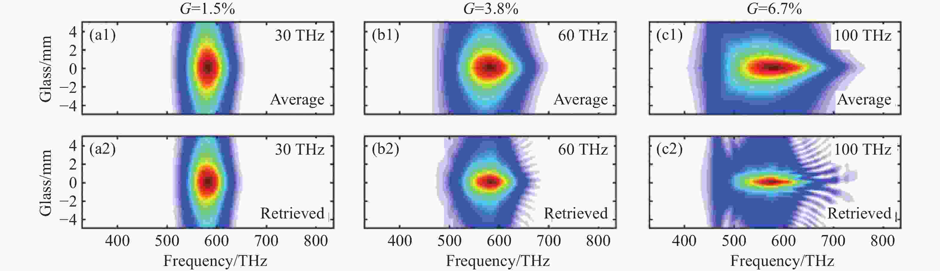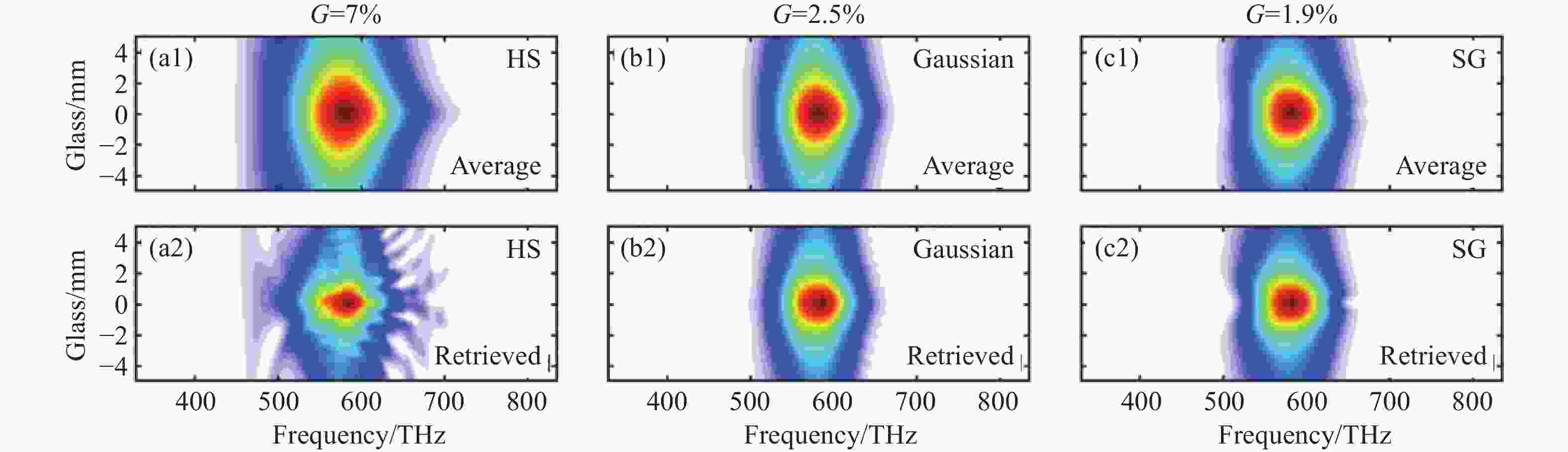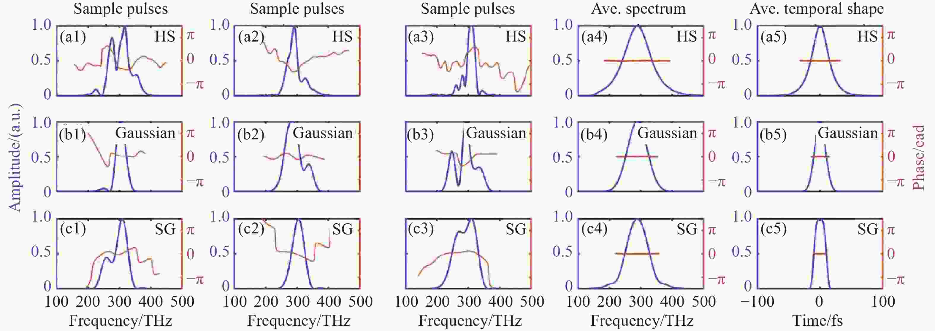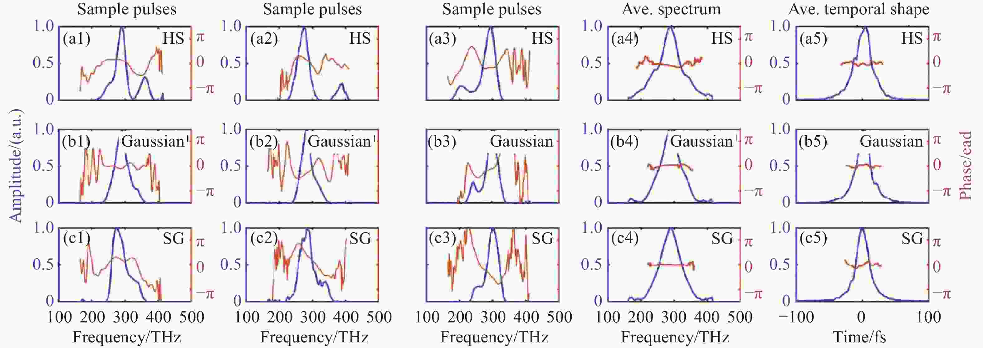 Figure 10.  Retrieved results for initial spectral shape of (a1−a5) HS, (b1−b5) Gaussian, and (c1−c5) SG. (a1−a3, b1−b3, c1−c3) Random sample pulses; (a4, b4, c4) retrieved average spectrum and phase; (a5, b5, c5) retrieved average temporal shape and phase.