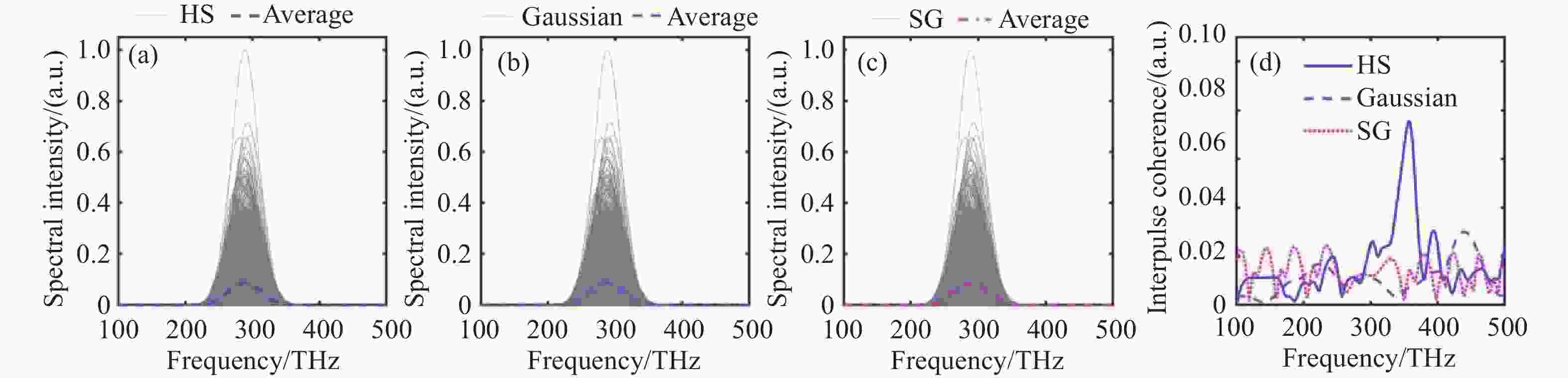 Figure 2.  Partially coherent pulse trains generated with initial spectral shapes: (a) HS, (b) Gaussian, (c) SG. Gray curves: 6000 randomly generated pulses. Dashed lines: averaged spectral intensity (blue: HS, violet: Gaussian, magenta: SG). (d) Interpulse coherence for HS (blue solid), Gaussian (violet dashed), and SG (magenta dotted).