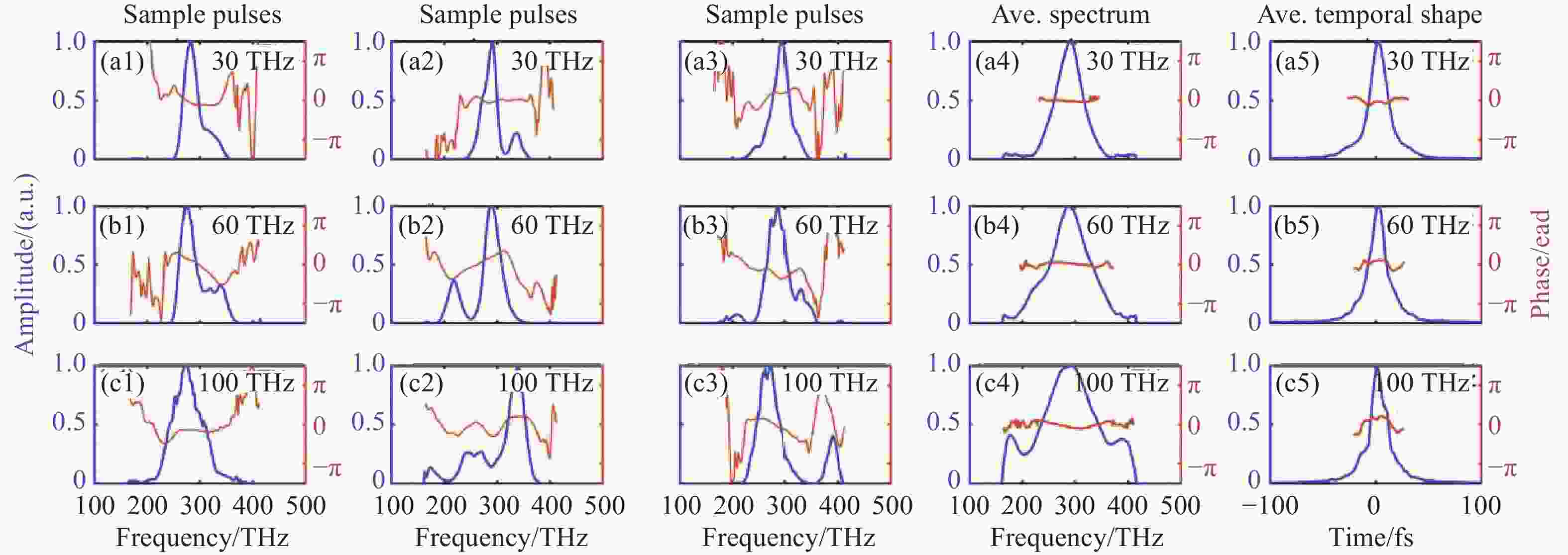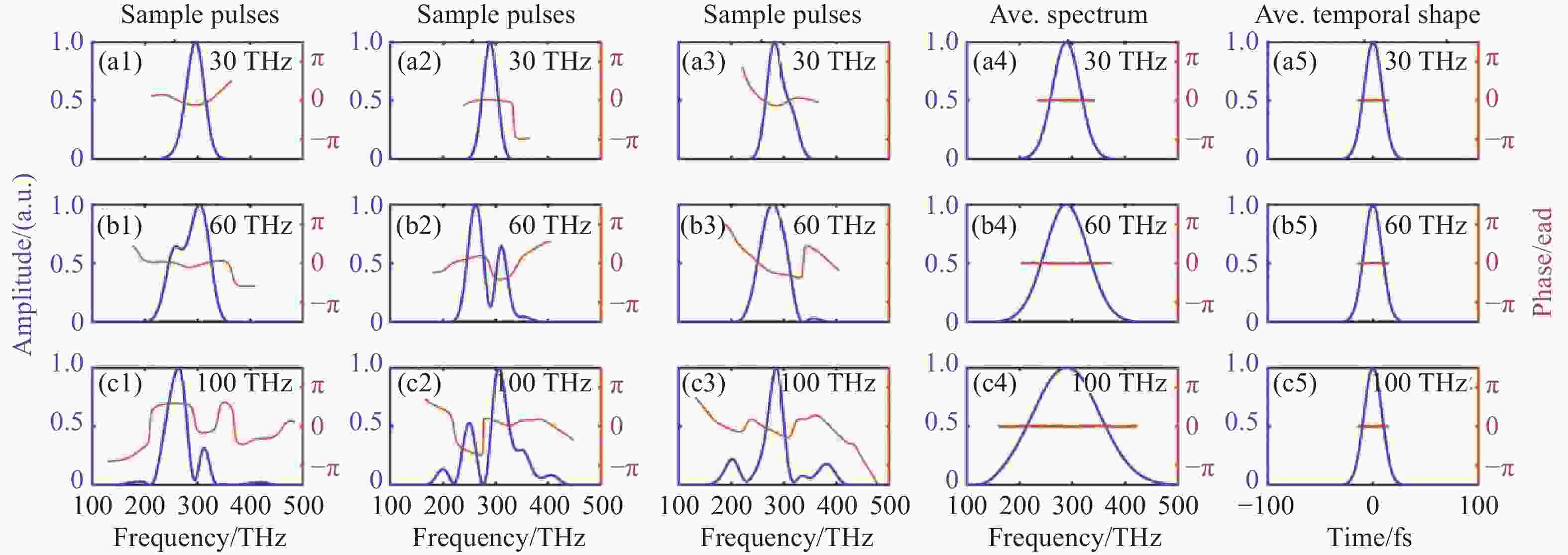 Figure 3.  Sample pulses for initial spectral width of (a1−a3) 30 THz, (b1−b3) 60 THz, and (c1−c3) 100 THz. (a4, b4, c4) Ensemble-averaged spectra; (a5, b5, c5) ensemble-averaged temporal shapes over 6000 pulses.