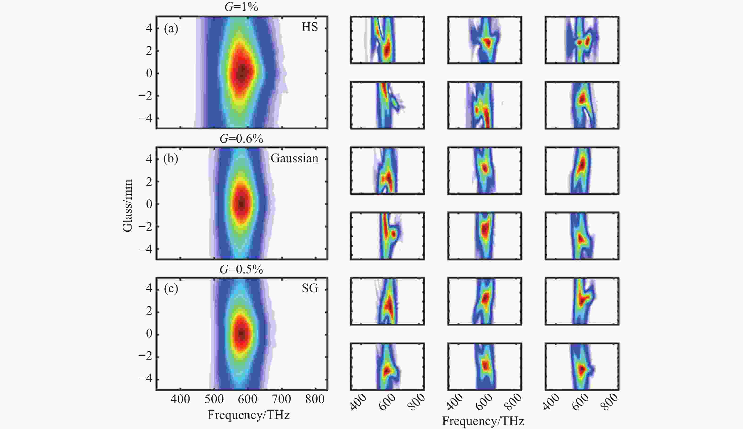 Figure 9.  Retrieved d-scan traces for (a) HS, (b) Gaussian, and (c) SG. Six representative subset traces are shown to the right of each panel.