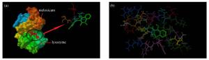 Figure 5. Theoretical modeling of the interaction between MEL and LYSO. (a) Regions where MEL interacts with LYSO and hydrogen bonds between docked MEL and amino acids residues of LYSO; (b) Distribution of amino and residues at the bonding site of MEL and LYSO