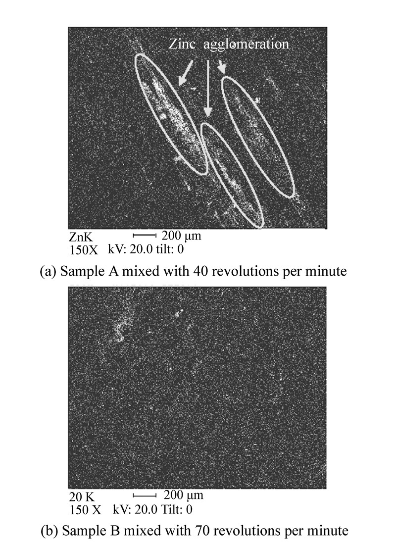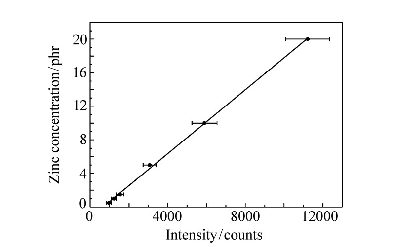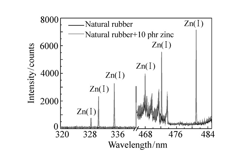 Laser-induced breakdown spectroscopy(LIBS) is a laser based method for the qualitative and quantitative analysis of chemical elements. It could be used for the analysis of rubber blends in the mixing room. In this paper, zinc dispersion in rubber blends is detected with LIBS by using a Nd: YAG laser with a wavelength of 1 064 nm and a pulse energy of 100 mJ. Experiments show that the quality of rubber products depends on the correct blending of the mixing components. For example short mixing times can lead to an inhomogeneous dispersion of these components. The intensity of the spectral lines is strongly affected by the setup parameters like the focal position. The use of calibration samples allows creating a calibration curve. Based on line scans, the zinc dispersion in these rubber blends can be analyzed. Variations in the homogeneity of the zinc caused by short mixing times or different rotation speed of the mixer can be detected by the evaluation of the intensity profile along these line scans.