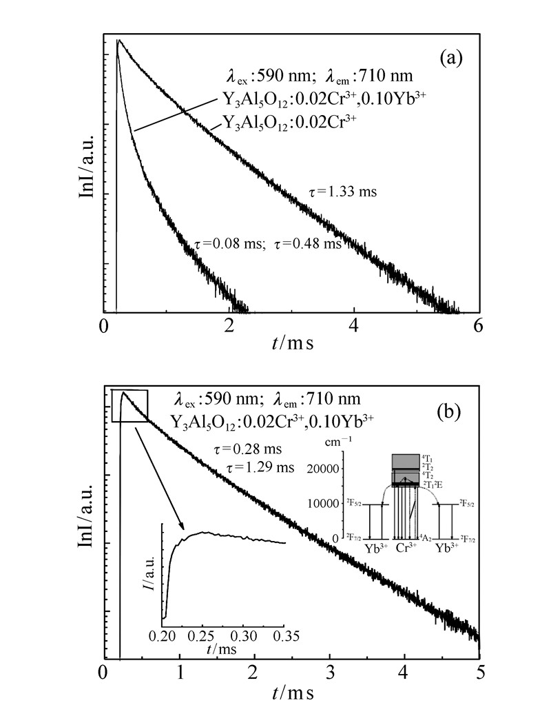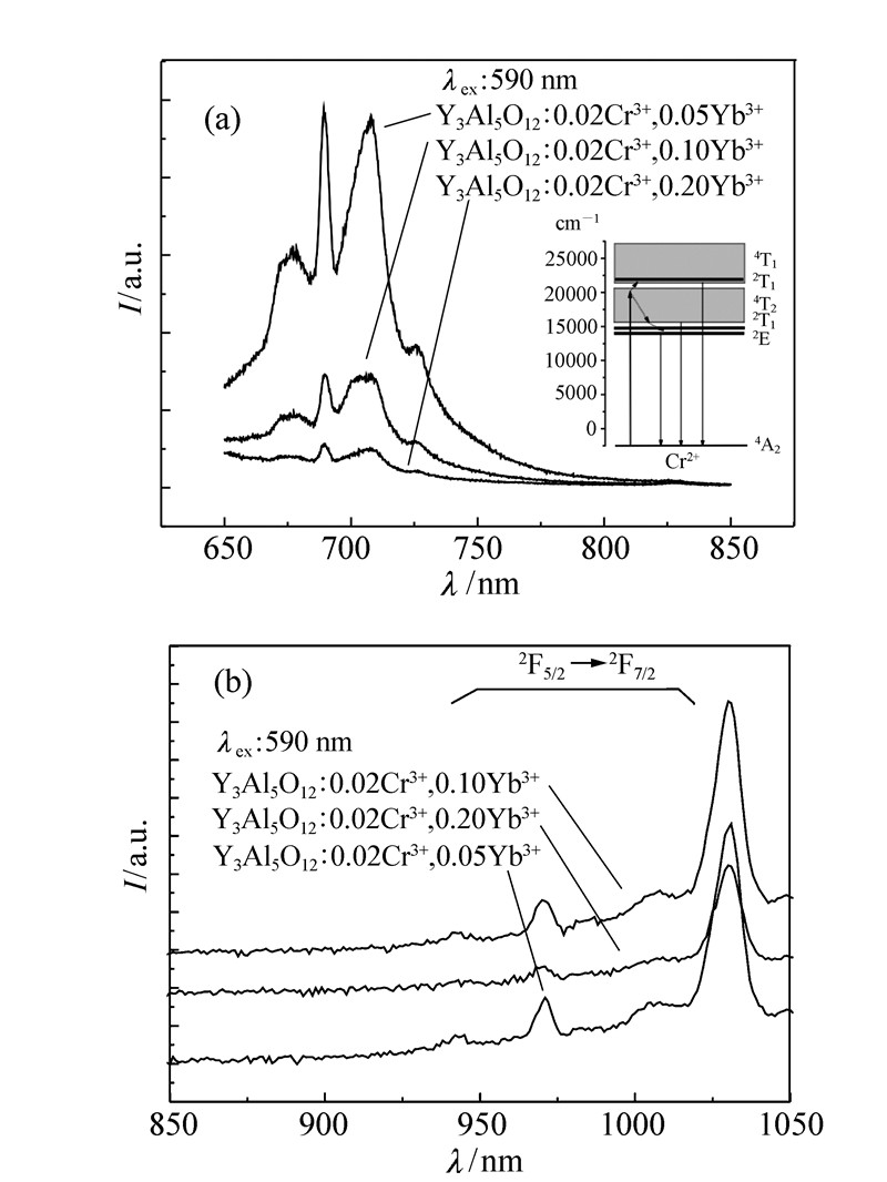 YAG: 0.02Cr3+,yYb3+ powder samples are prepared by high temperature solid-phase reaction method in this paper. Near-infrared emission properties of these powder materials are investigated including emission properties of Cr3+ and Yb3+, luminescence lifetimes of Cr3+: 4T2 and Yb3+: 2F5/2 and comparison of their population time. Optimal doping concentration of Yb3+(10%) is given. Experiments indicate that the broadband spectral conversion makes the Yb3+: 2F5/2→2F7/2 radiation transition obtain a favorable increase around 1 000 nm by the efficient energy transfer from Cr3+ to Yb3+, which laids a solid foundation to enhance solar photovoltaic conversion efficiency.