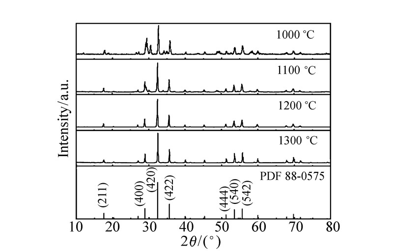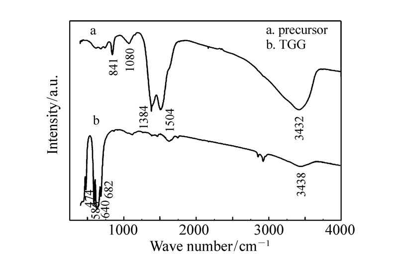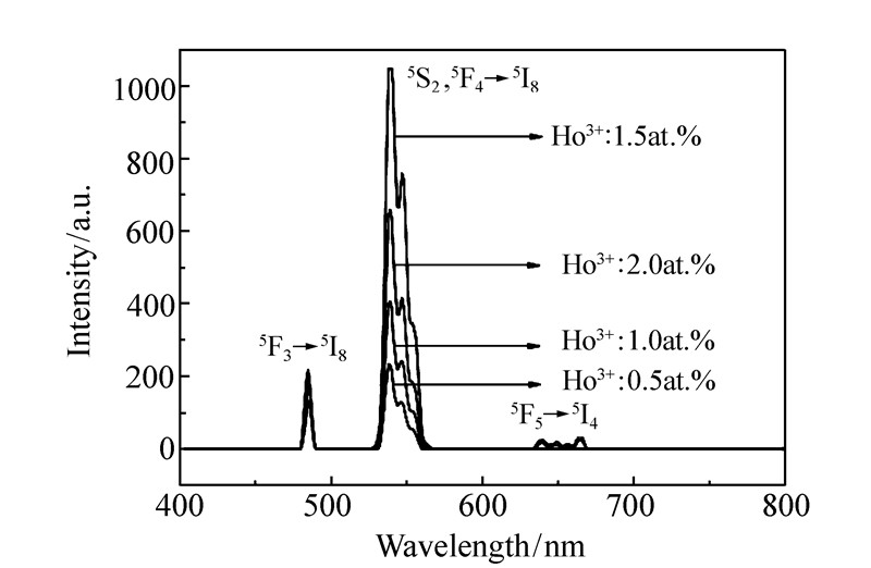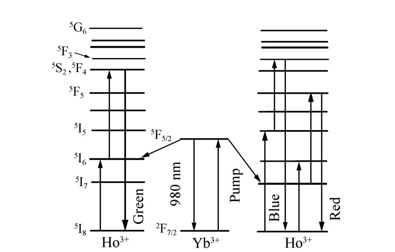 With ammonium bicarbonate as the precipitating agent, using Tb4O7, Ga2O3, Ho2O3, Yb2O3 as raw materials(the stoichiometry of Tb4O7 and Ga2O3) is 3: 5 and doping Yb3+(8at.%)/Ho3+(0.5at.%、1at.%、1.5at.%、2.0at.% respectively), Ho,Yb: Tb3Ga5O12(Ho,Yb: TGG) nano-powder was sintered at 1 200 ℃ for 10 h to obtain a pure phase. The samples were characterized by XRD, TG-DTA, Infrared Spectroscopy(IRS), Scanning Electron Microscopy(SEM) and upconversion emission spectroscopy. The experimental results show that the average grain size of the samples is 38.10 nm under the temperature of 1 200 ℃. When the samples with Yb3+(8at.%)/Ho3+(1.5at.%) concentrations were used, there was a clear upconversion luminescence in the wavelength rage of blue, green and red by 980 nm LD. The formation mechanism was discussed at the same time. Analyse indicates that Ho3+ transits from excited states 5S2 and 5F4 to ground state 5I8, achieving the launch of green, and it transits from excited states 5F5 and 5F3 to ground state 5I8, achieving the launch of red and blue respectively.