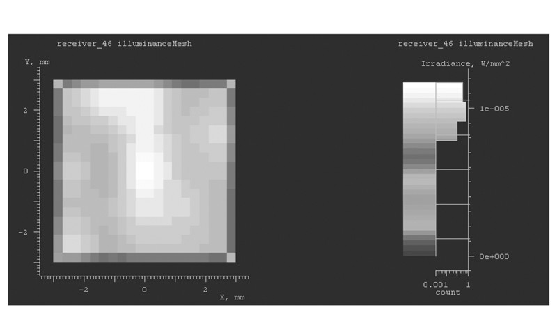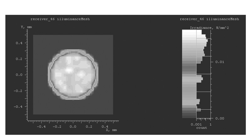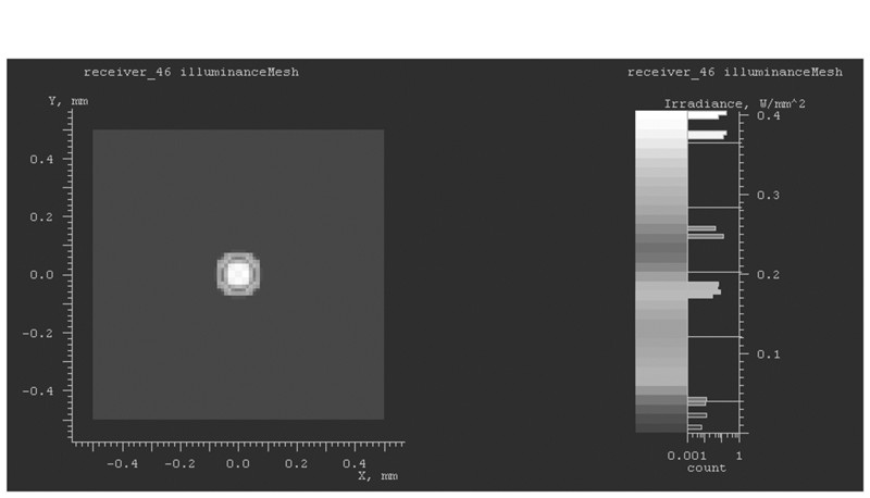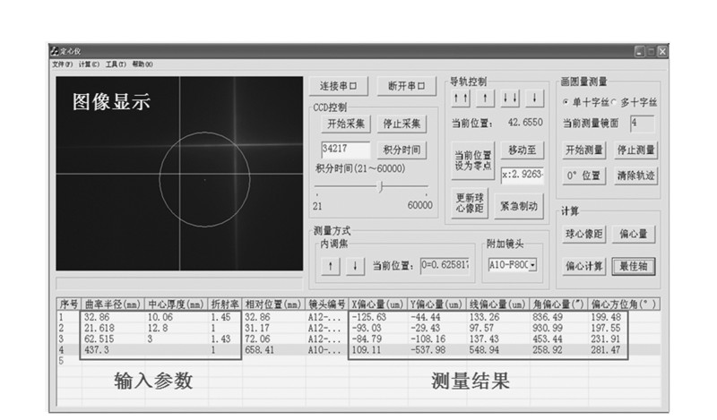 To improve current equipments in the market, a lens-eccentricity-measuring optical system that combines the focusing method and lens-switching method is designed in this paper. This optical system can be used to measure lens with curvature radius from -∞ to +∞, as well as maintain the test accuracy. Lighttools software is used to trace the light ray and analyze stray light distribution of this optical system. Results show that the intensity of the stray light after multiple reflection inside the collimated lens is low and negligible. The stray light intensity becomes stronger when the image distances of sphere centers are nearby in the testing lens. So in the later image processing, the contrast of target images must be strengthened. Measurement experiments are done by using the equipment with this optical system. All the experimental results further verify the correctness of stray light analyzing.